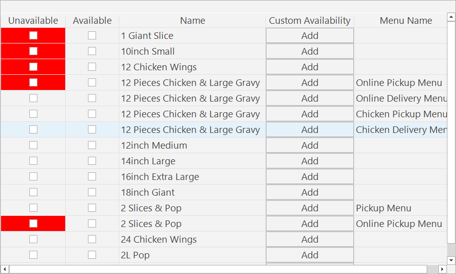 Only the first two rows, "1 Giant Slice" and "10inch Small", should have the unavailable cells in red. These two rows are consistently formatted correctly, but other rows have both unavailable and available cells formatted in red, too. The rows which have incorrect formatted do not seem to be consistent.