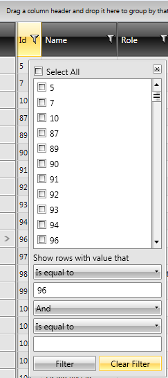 I have a RadGridView with many column and in all of them I can filter data using the popup window (see attached gridview.png). In one of the columns, which has integers as data source, when I tick one of the available options it works fine, but when I use the filter "equals to" and I set a number my program crashes (see error.png). It's curious because I noticed that if I first select one of the others filters first ('is greater tham', 'is not equal to', ...) and them select the 'is equals to' it works!