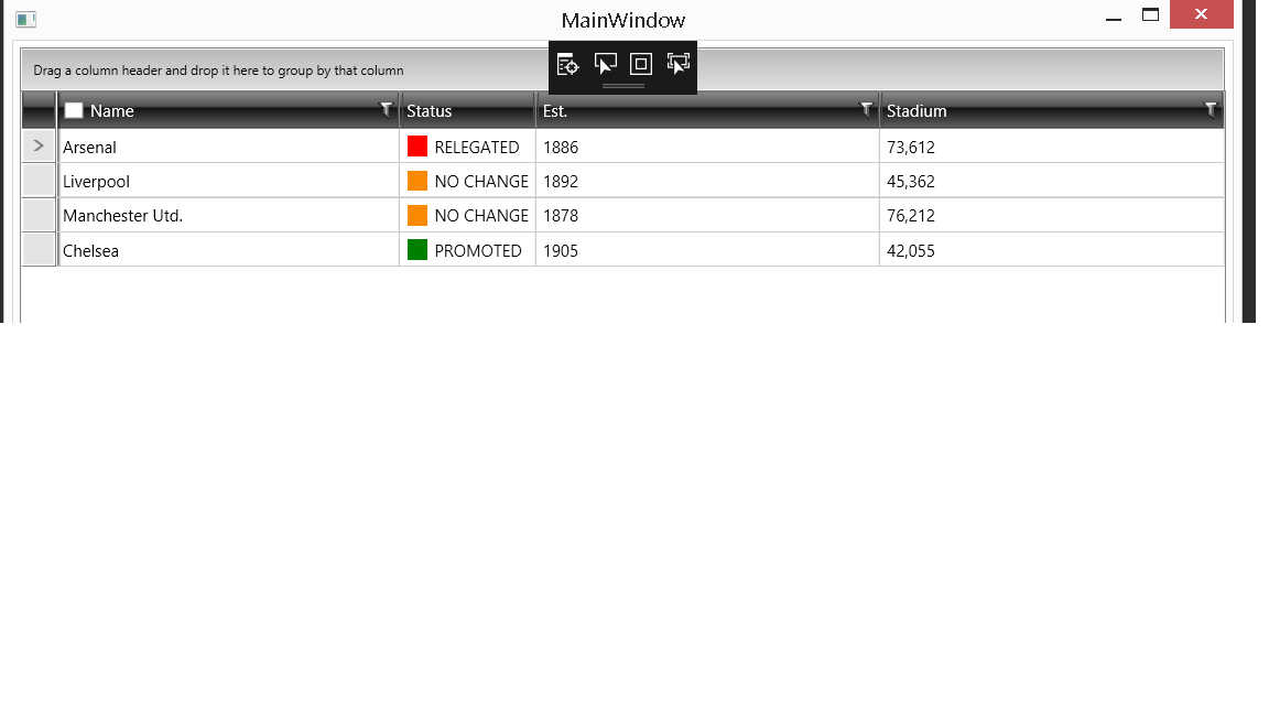 <telerik:GridViewColumn FilterMemberPath="STATUS_STRING"IsFilterable="True"Header="Status" Width="1*"> <telerik:GridViewColumn.CellTemplate> <DataTemplate> <Grid> <Border HorizontalAlignment="Left" VerticalAlignment="Center"Style="{Binding WARNING_STATUS, Converter={StaticResource navStatusToColorCodeConverter}}"> </Border> <TextBlock Margin="20 0 0 0" Text="{Binding STATUS_STRING}"></TextBlock> </Grid> </DataTemplate> </telerik:GridViewColumn.CellTemplate></telerik:GridViewColumn>Hello, I'm using popup default filtering for my gridview and define all my columns dynamically in code.