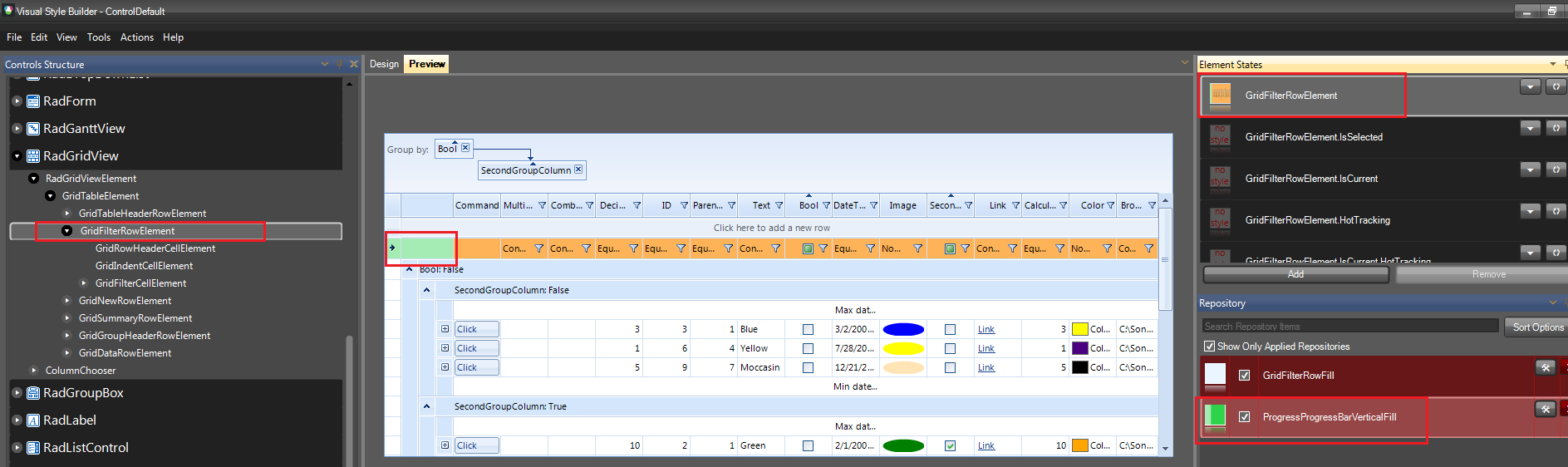 I am trying to modify the color of the filter row in a RadGridView in the visual style builder. I have changed the BackColor property of the GridFilterRowElement but the filter row cell color does not change. Am I setting the wrong property?