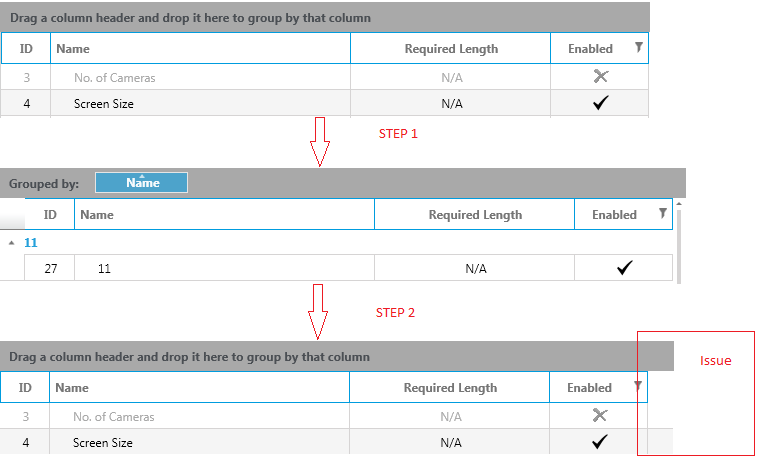 <telerik:RadGridView Name="RadgridHoover" DockPanel.Dock="Top" BorderThickness="1,0,0,0" BorderBrush="LightGray" CanUserDeleteRows="True" CanUserInsertRows="True" ShowColumnHeaders="True" ShowGroupPanel="{Binding IsShowGroupPanel, Mode=TwoWay}" AlternateRowBackground="WhiteSmoke" AlternationCount="2" AutoGenerateColumns="False" SelectionMode="Multiple" IsReadOnly="True" IsFilteringAllowed="True" EditTriggers="CurrentCellClick" SelectionUnit="FullRow" EnableColumnVirtualization="False" EnableRowVirtualization="True" RowIndicatorVisibility="Collapsed" GridLinesVisibility="Both" behaviors:GridColumnsBindingBehavior.Columns="{Binding Columns, Mode=TwoWay}" ItemsSource="{Binding MembersTable, Mode=TwoWay}" SelectedItem="{Binding SelectedItem}" caliburn:Message.Attach="[Event SelectionChanged] = [Action MembersGridSelectionChanged($executionContext)];[Event DataLoaded] = [Action GridDataLoaded($executionContext)];[Event LoadingRowDetails] = [Action LoadingRowDetails($executionContext)]" DataLoadMode="Asynchronous" > </telerik:RadGridView>The issue is when i group by a column, then i remove item in group panel, the size of group panel is not resize correctly.