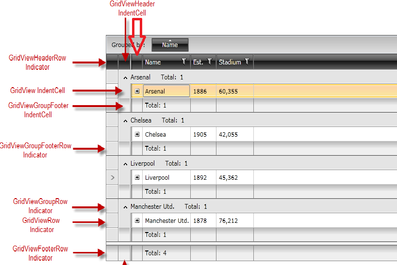 The first part for the header row is presented by the "Part_IndicatorPresenter" border. Please check the visual structure for the indent cells of the GridView and style all the relevant elements.