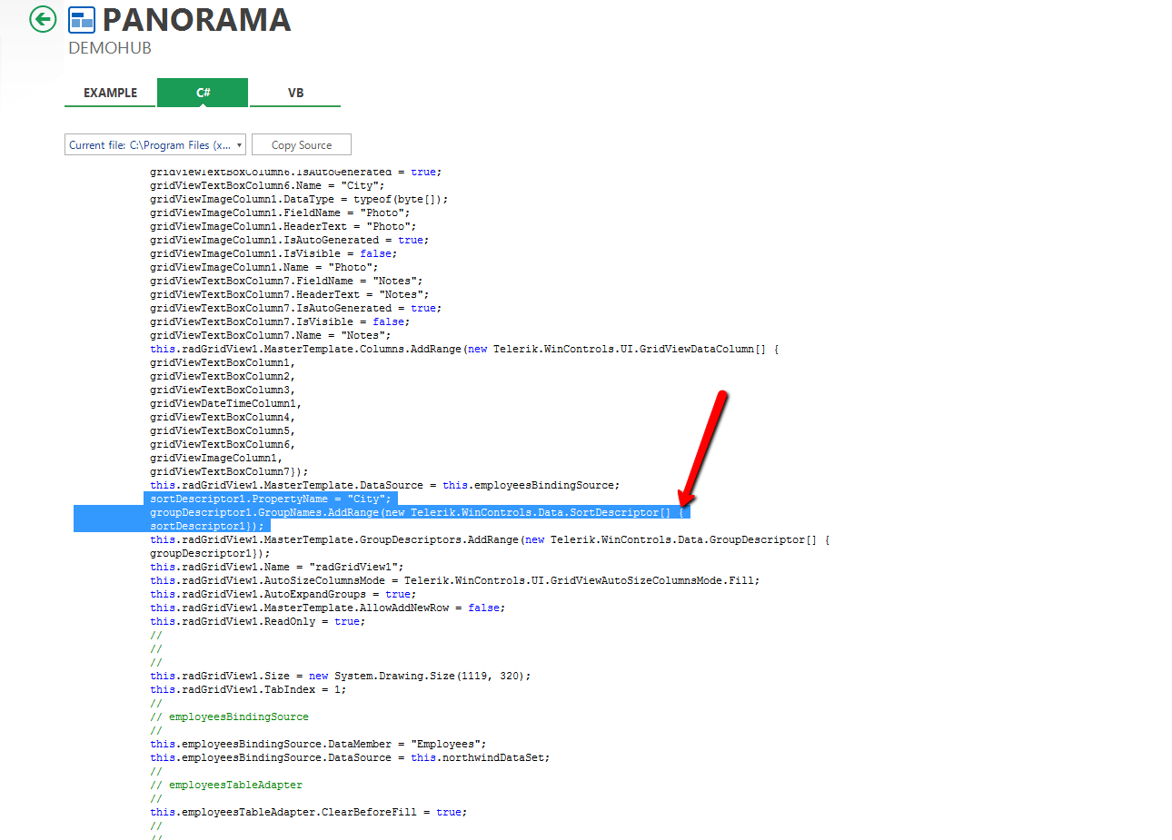 2) I can't see how the demo app gets the "City" button in the grouping bar. I can't emulate that at all. How is that done please? And can all that be hidden?