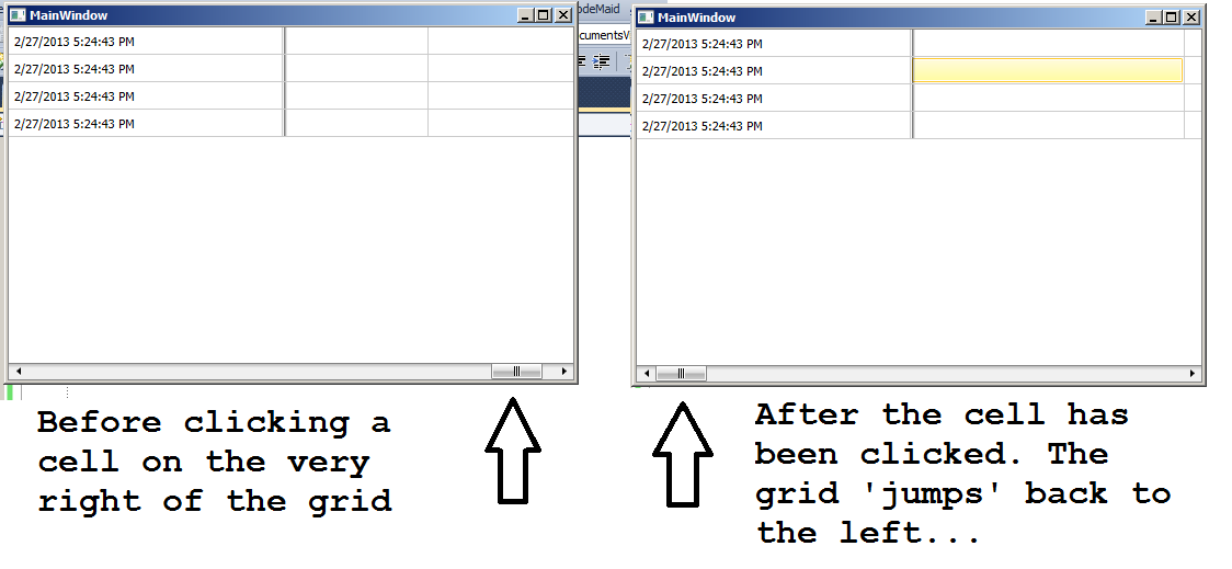 I have a rad grid view with the settings below. I must bind an item that contains lot's of properties, meaning a lot of columns and meaning that the horizontal scrollbar will appear at the bottom of the grid. I therefore need to scroll around to view all columns / cells in the grid. When I select a cell to the very right of the grid (after scrolling), the scrollbar automatically jumps to the left, sometimes to the beginning of the grid, sometimes about mid-way in the grid. I then have to scroll back again manually to the right to find the cell I wanted to edit . This is highly inconvenient when you have to work on a grid with lot's of data. I attached a screenshot highlighting the issue.