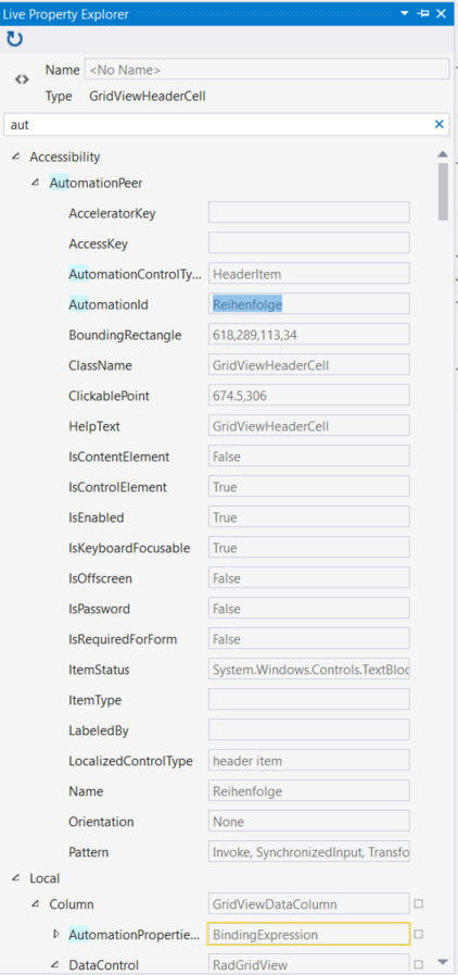 We have a RadGridView with localised columns and we would like to use string that remain same for all localised value. In order to achieve we use UniqueName="Id" and Set AutomationProperties.AutomationId="{Binding UniqueName, RelativeSource={RelativeSource Self}}" but when we run application the Header which is a localised string always get precedence and we end up with header value.