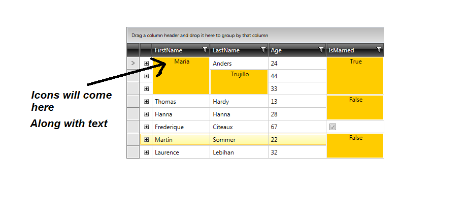 I would like to use RadGridView for merge cell feature. I have requirement that it should display icon along with Text which will come from database. Icons will dynamic icons based on condition.