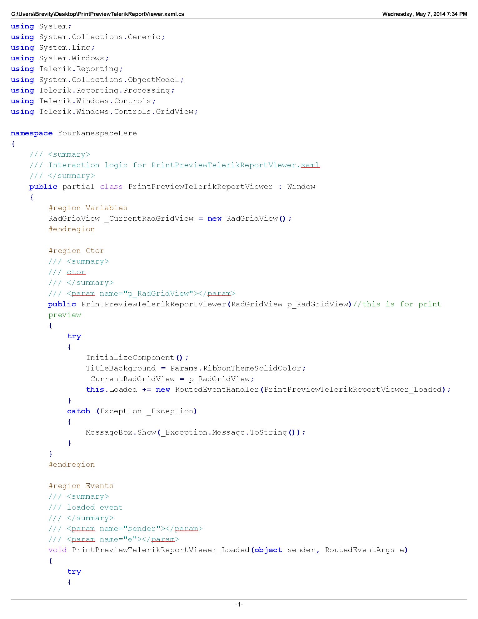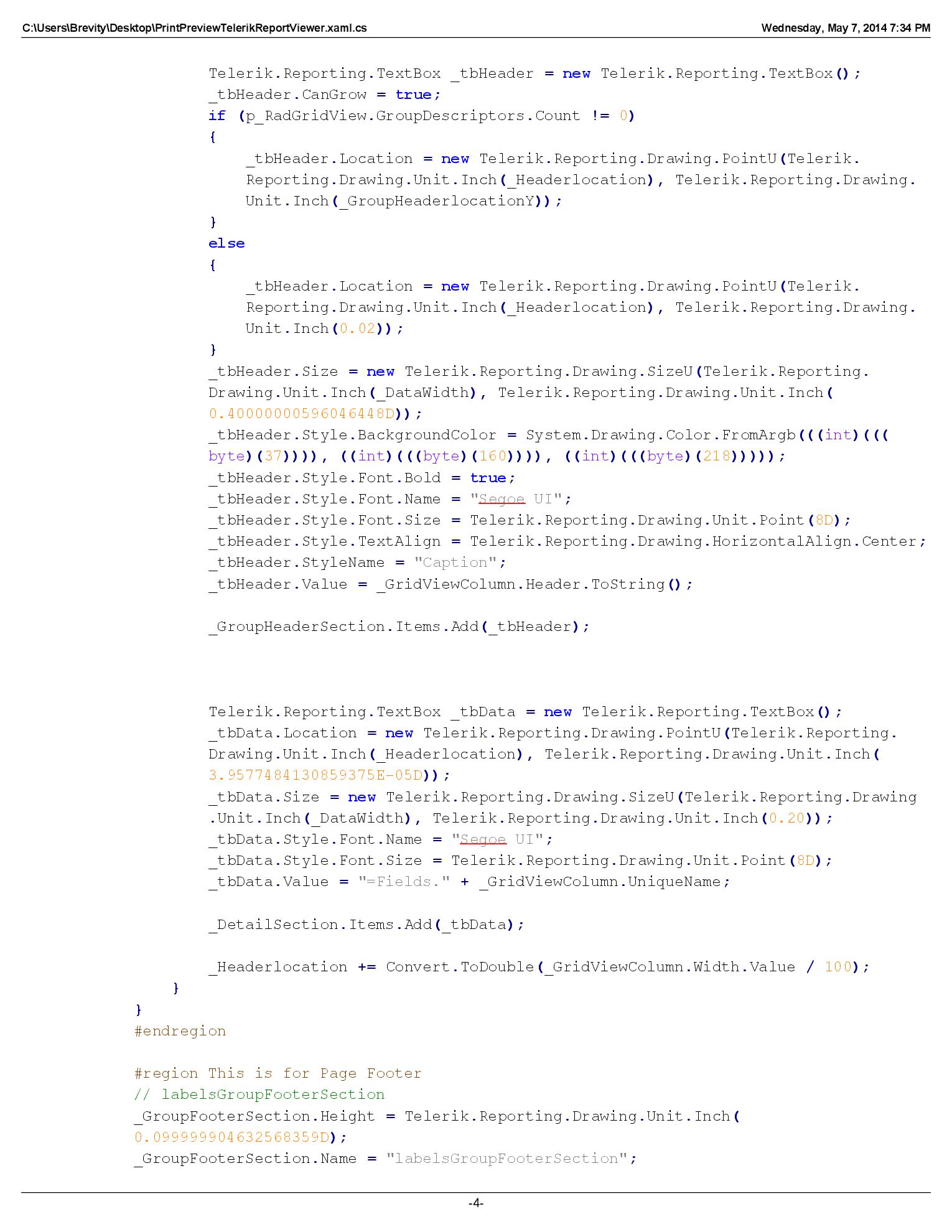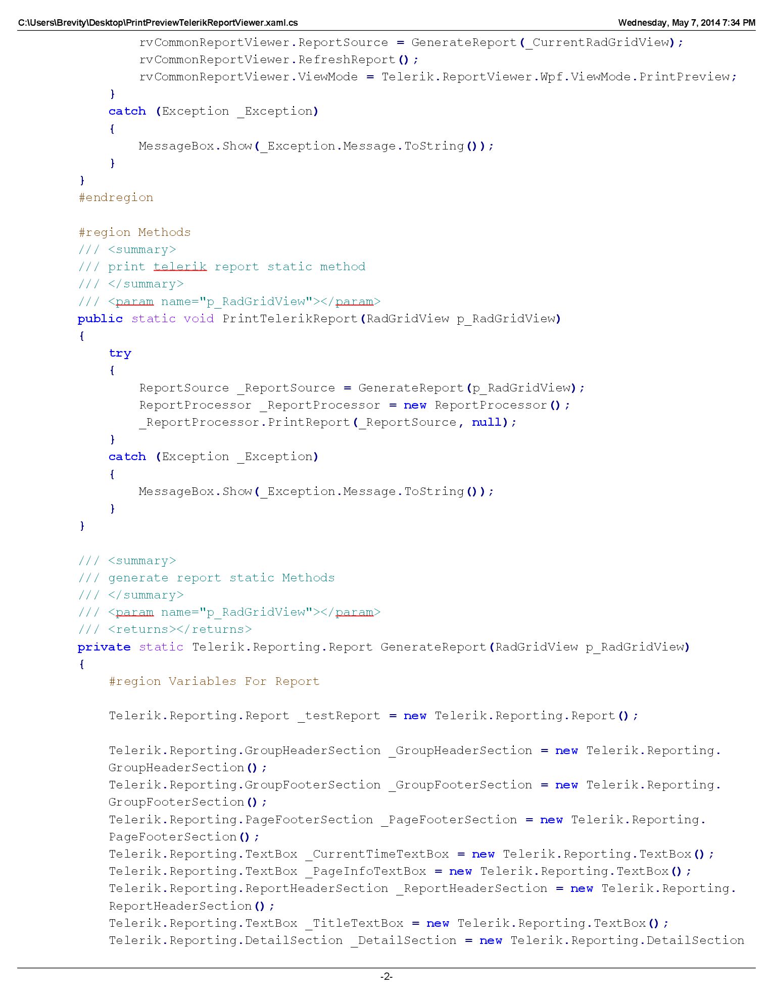 Using following code, we can print & preview of RadGridView using Telerik Reproting with grouping, filtering functionality of RadGridView with nos. of columns are generated dynamic in the Report.