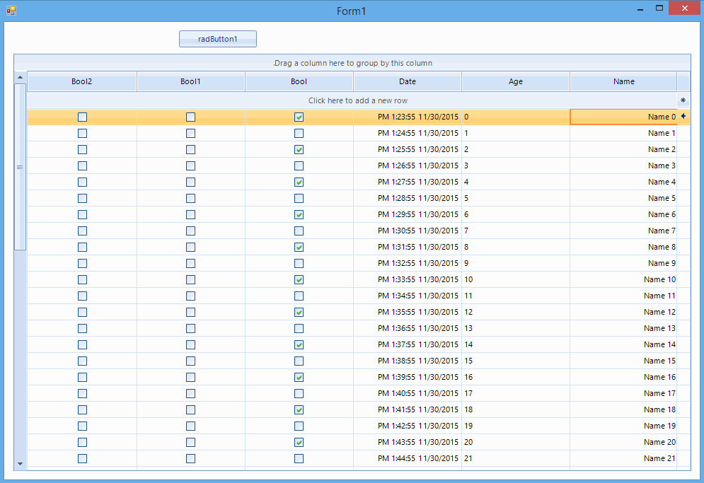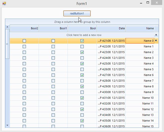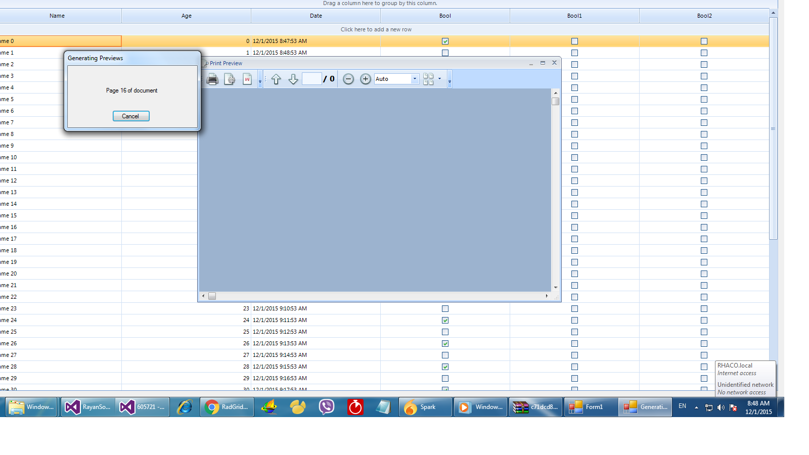 public partial class Form1 : Form{ public Form1() { InitializeComponent(); this.radGridView1.DataSource = this.GetData(); this.radGridView1.AutoSizeColumnsMode = GridViewAutoSizeColumnsMode.Fill; this.radGridView1.RightToLeft = System.Windows.Forms.RightToLeft.Yes; this.radGridView1.PrintCellFormatting += radGridView1_PrintCellFormatting; foreach (var col in this.radGridView1.Columns) { col.HeaderTextAlignment = ContentAlignment.MiddleLeft; } } private void radGridView1_PrintCellFormatting(object sender, PrintCellFormattingEventArgs e) { if (e.Row is GridViewTableHeaderRowInfo && this.radGridView1.RightToLeft == System.Windows.Forms.RightToLeft.Yes) { e.PrintCell.TextAlignment = ContentAlignment.MiddleRight; } } private DataTable GetData() { DataTable dt = new DataTable(); dt.Columns.Add("Name", typeof(string)); dt.Columns.Add("Date", typeof(DateTime)); dt.Columns.Add("Bool", typeof(bool)); dt.Columns.Add("Bool1", typeof(bool)); dt.Columns.Add("Bool2", typeof(bool)); for (int i = 0; i < 50; i++) { dt.Rows.Add("Name " + i, DateTime.Now.AddMinutes(i), i % 2 == 0 ? true : false, false, false); } return dt; } private void radButton1_Click(object sender, EventArgs e) { this.radGridView1.PrintPreview(); }}I am also sending you a gif file showing the result on my end.