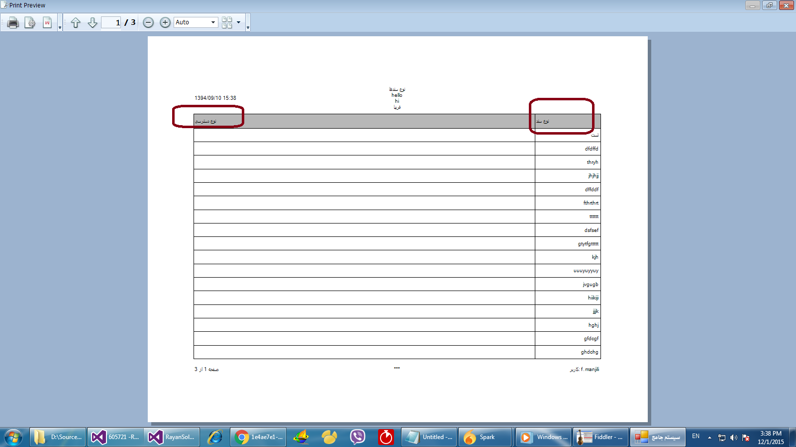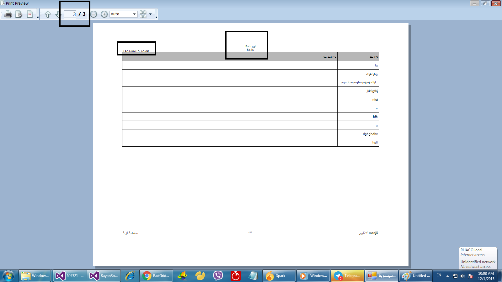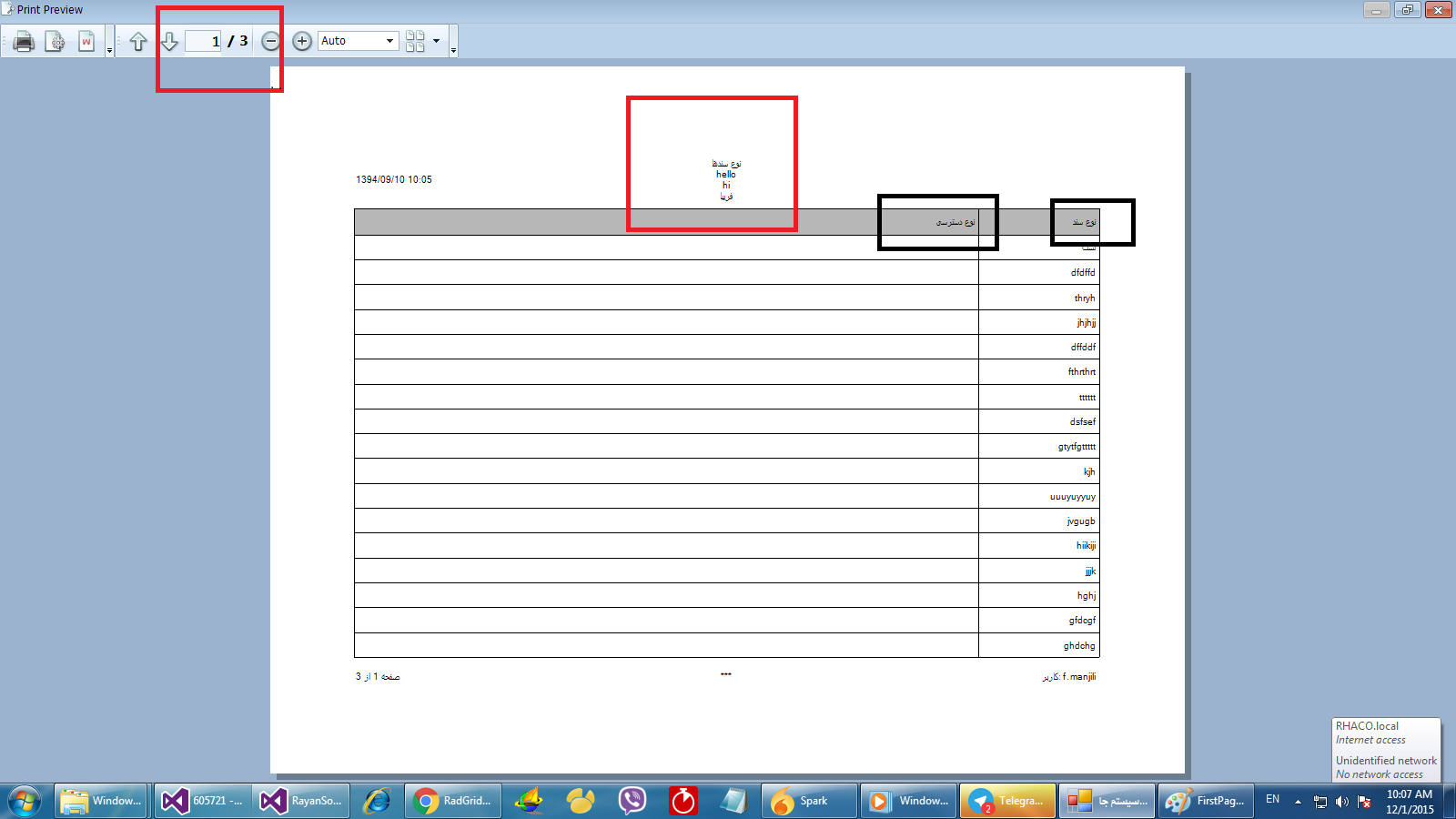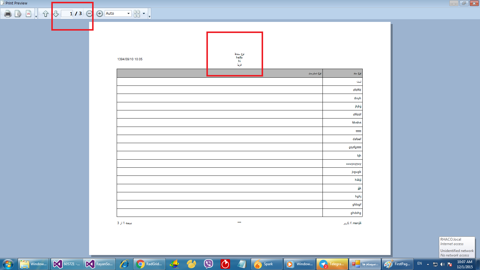 public partial class Form1 : Form{ public Form1() { InitializeComponent(); this.radGridView1.DataSource = this.GetData(); this.radGridView1.AutoSizeColumnsMode = GridViewAutoSizeColumnsMode.Fill; this.radGridView1.RightToLeft = System.Windows.Forms.RightToLeft.Yes; } private DataTable GetData() { DataTable dt = new DataTable(); dt.Columns.Add("Name", typeof(string)); dt.Columns.Add("Age", typeof(int)); dt.Columns.Add("Date", typeof(DateTime)); dt.Columns.Add("Bool", typeof(bool)); dt.Columns.Add("Bool1", typeof(bool)); dt.Columns.Add("Bool2", typeof(bool)); for (int i = 0; i < 50; i++) { dt.Rows.Add("Name " + i, i, DateTime.Now.AddMinutes(i), i % 2 == 0 ? true : false, false, false); } return dt; } private void radButton1_Click(object sender, EventArgs e) { for (int start = this.radGridView1.Columns.Count - 1; start > 2; start--) { this.radGridView1.Columns[start].IsVisible = false; } GridPrintStyle style = new GridPrintStyle(); style.FitWidthMode = PrintFitWidthMode.FitPageWidth; this.radGridView1.PrintStyle = style; MyPrintDocument doc = new MyPrintDocument(); doc.HeaderHeight = 30; doc.HeaderFont = new Font("Arial", 12); doc.LeftHeader = "Left Header"; doc.MiddleHeader = "Middle header"; doc.RightHeader = "Right header"; doc.AssociatedObject = this.radGridView1; RadPrintPreviewDialog dialog = new RadPrintPreviewDialog(doc); dialog.Show(); doc.EndPrint += doc_EndPrint; } private void doc_EndPrint(object sender, PrintEventArgs e) { foreach (var col in this.radGridView1.Columns) { if (!col.IsVisible) { col.IsVisible = true; } } }}public class MyPrintDocument : RadPrintDocument{ protected override void PrintHeader(System.Drawing.Printing.PrintPageEventArgs args) { if (this.HeaderHeight > 0) { base.PrintHeader(args); this.HeaderHeight = 0; } }}I am also sending you a short video showing the result on my end.