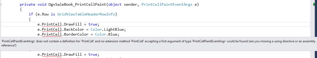 The PrintCellPaint event does not provide information about the cell. If you need to change the fill, back color, and border properties please handle the PrintCellFormatting event.