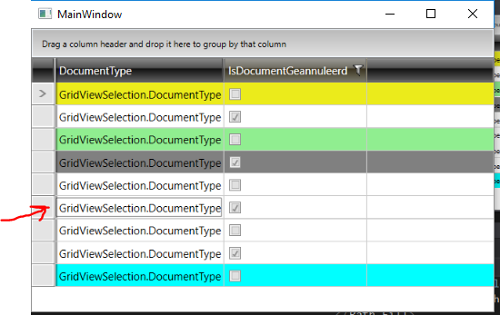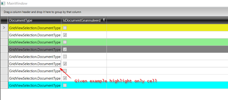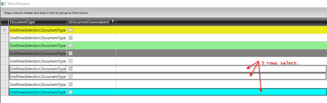 <telerik:RadGridView.Resources> <Style TargetType="{x:Type telerik:GridViewRow}"> <Style.Triggers> <DataTrigger Binding="{Binding Path=DocumentType.DocumentTypeID}" Value="1"> <Setter Property="Background" Value="#FFEBEB1B" /> </DataTrigger> <DataTrigger Binding="{Binding Path=DocumentType.DocumentTypeID}" Value="3"> <Setter Property="Background" Value="LightGreen" /> </DataTrigger> <DataTrigger Binding="{Binding Path=DocumentType.DocumentTypeID}" Value="9"> <Setter Property="Background" Value="Cyan" /> </DataTrigger> <DataTrigger Binding="{Binding Path=DocumentType.DocumentTypeID}" Value="10"> <Setter Property="Background" Value="LightBlue" /> </DataTrigger> <DataTrigger Binding="{Binding Path=DocumentType.DocumentTypeID}" Value="4"> <Setter Property="Background" Value="Gray" /> </DataTrigger> <DataTrigger Binding="{Binding Path=IsDocumentGeannuleerd}" Value="True"> <Setter Property="Background" Value="IndianRed" /> </DataTrigger> <!-- THE CODE BELOW IS NOT WORKING --> <Trigger Property="IsSelected" Value="True"> <Setter Property="Background" Value="Transparent"/> </Trigger> </Style.Triggers> </Style></telerik:RadGridView.Resources>Any help would be greatly appreciated.