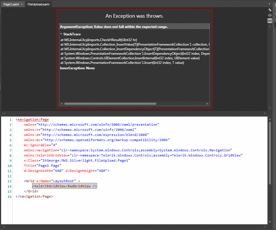 I'm facing strange problem in my Blend3 (please refer to 'blend' attach). I just created new page and put <telerikGridView:RadGridView /> on it. The exception I'm getting is: "Value does not fall within the expected range".