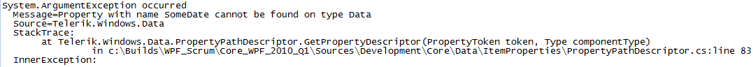 When the window is loaded, I receive a first chance exception of 'Property with name <..> cannot be found ot type BaseT.