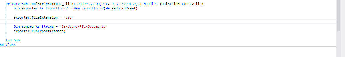 Imports Telerik.WinControls.DataImports Telerik.WinControls.UI.ExportImports Telerik.WinControlsImports System.IOPrivate Sub ToolStripButton2_Click(sender As Object, e As EventArgs) Handles ToolStripButton2.Click Dim exporter As ExportToCSV = New ExportToCSV(Me.RadGridView1) exporter.FileExtension = "csv" Dim camara As String = "C:\Users\FTL\Documents" exporter.RunExport(camara) End Sub