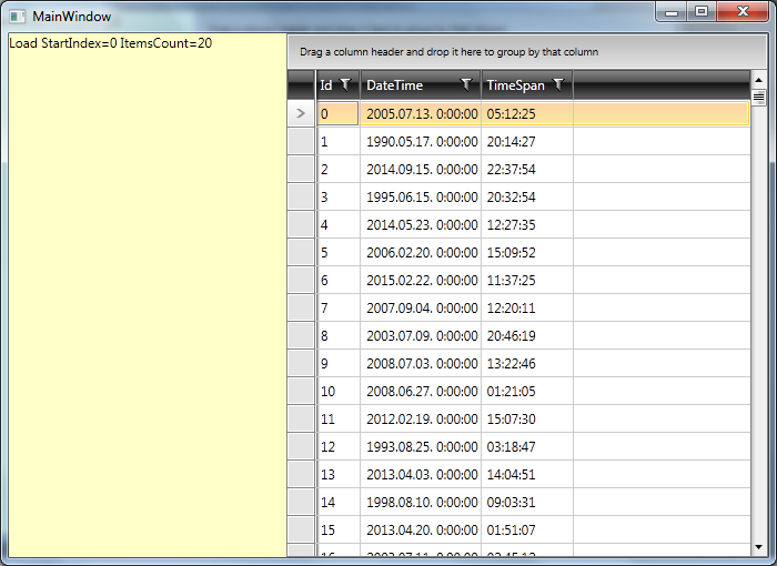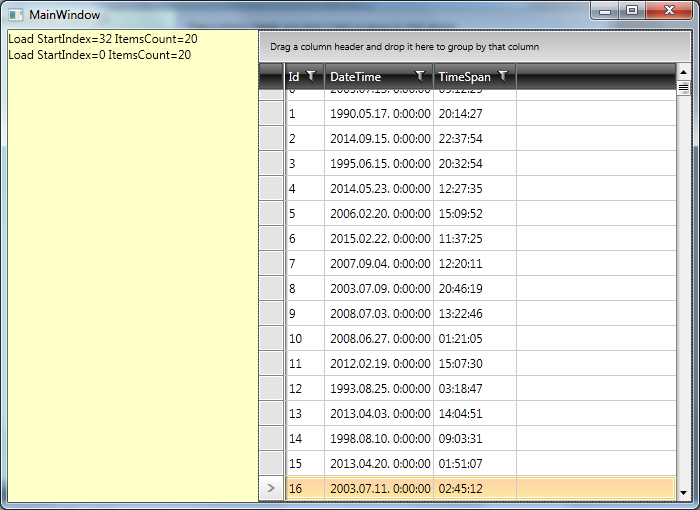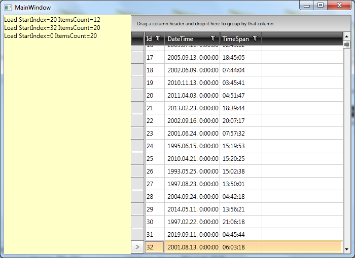 <Window x:Class="VirtualQueryableCollectionViewBugDemo.MainWindow" xmlns:telerik="http://schemas.telerik.com/2008/xaml/presentation" Title="MainWindow" Height="510" Width="700"> <DockPanel> <TextBlock Width="250" Text="{Binding Log}" /> <telerik:RadGridView ItemsSource="{Binding VirtualQueryableCollectionView}" EnableRowVirtualization="True" /> </DockPanel></Window>MainWindow.xaml.cs