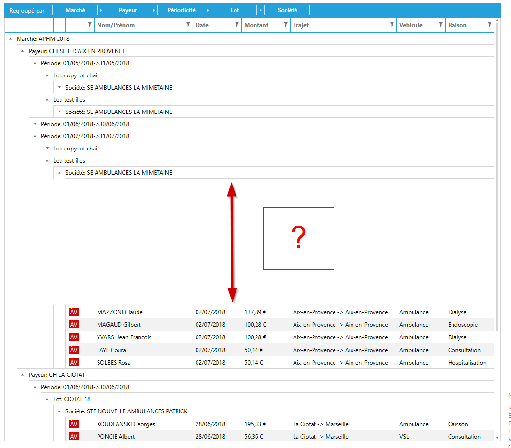 <telerik:RadGridView x:Name="GridViewListingNumberList" GroupRenderMode="Flat" VerticalAlignment="Top" VerticalContentAlignment="Top" telerik:StyleManager.Theme="Windows" Background="Transparent" ColumnBackground="Transparent" AlternationCount="2" SelectionUnit="FullRow" ItemsSource="{Binding List.Presenter.ResultDisplay}" MaxHeight="900" Margin="5,5,5,10" CanUserFreezeColumns="False" AutoExpandGroups="False" RowIndicatorVisibility="Collapsed" AutoGenerateColumns="False" IsReadOnly="True" MouseDoubleClick="shareGrid_MouseDoubleClick" ShowGroupPanel="true"> <telerik:RadGridView.Columns> <telerik:GridViewDataColumn IsVisible="true" Header="Marché" UniqueName="MarketName" Width="auto" DataMemberBinding="{Binding MarketName}" IsReadOnly="True" ShowColumnWhenGrouped="False"> <telerik:GridViewDataColumn.GroupHeaderTemplate> <DataTemplate> <TextBlock Text="{Binding Group.Key, StringFormat='Marché: {0}'}" VerticalAlignment="Center"/> </DataTemplate> </telerik:GridViewDataColumn.GroupHeaderTemplate> </telerik:GridViewDataColumn> <telerik:GridViewDataColumn IsVisible="true" Header="Payeur" UniqueName="PayerName" Width="auto" DataMemberBinding="{Binding PayerName}" IsReadOnly="True" ShowColumnWhenGrouped="False"> <telerik:GridViewDataColumn.GroupHeaderTemplate> <DataTemplate> <TextBlock Text="{Binding Group.Key, StringFormat='Payeur: {0}'}" VerticalAlignment="Center"/> </DataTemplate> </telerik:GridViewDataColumn.GroupHeaderTemplate> </telerik:GridViewDataColumn> <telerik:GridViewDataColumn IsVisible="true" Header="Périodicité" UniqueName="PeriodicityName" Width="auto" DataMemberBinding="{Binding PeriodicityName}" IsReadOnly="True" ShowColumnWhenGrouped="False"> <telerik:GridViewDataColumn.GroupHeaderTemplate> <DataTemplate> <TextBlock Text="{Binding Group.Key, StringFormat='Période: {0}'}" VerticalAlignment="Center"/> </DataTemplate> </telerik:GridViewDataColumn.GroupHeaderTemplate> </telerik:GridViewDataColumn> <telerik:GridViewDataColumn IsVisible="true" Header="Lot" UniqueName="MarketBatchName" Width="auto" DataMemberBinding="{Binding MarketBatchName}" IsReadOnly="True" ShowColumnWhenGrouped="False"> <telerik:GridViewDataColumn.GroupHeaderTemplate> <DataTemplate> <TextBlock Text="{Binding Group.Key, StringFormat='Lot: {0}'}" VerticalAlignment="Center"/> </DataTemplate> </telerik:GridViewDataColumn.GroupHeaderTemplate> </telerik:GridViewDataColumn> <telerik:GridViewDataColumn IsVisible="true" Header="Société" UniqueName="CompanyName2" Width="auto" DataMemberBinding="{Binding CompanyName2}" IsReadOnly="True" ShowColumnWhenGrouped="False"> <telerik:GridViewDataColumn.GroupHeaderTemplate> <DataTemplate> <TextBlock Text="{Binding Group.Key, StringFormat='Société: {0}'}" VerticalAlignment="Center"/> </DataTemplate> </telerik:GridViewDataColumn.GroupHeaderTemplate> </telerik:GridViewDataColumn> <telerik:GridViewDataColumn Header="" Width="30" SortMemberPath="Statut" IsReadOnly="True"> <telerik:GridViewDataColumn.CellTemplate> <DataTemplate> <TextBlock x:Name="OutwardTextSPState" Width="20" TextAlignment="Center"> <TextBlock.Style> <Style TargetType="TextBlock" BasedOn="{StaticResource SmallFontStyle}"> <Style.Triggers> <DataTrigger Binding="{Binding Statut}" Value="TOTELETRANSMIT"> <Setter Property="Text" Value="ÀT" /> <Setter Property="ToolTip" Value="À TÉLÉTRANSMETTRE" /> <Setter Property="Background" Value="{StaticResource HighlightBackgroundBrush}" /> </DataTrigger> <DataTrigger Binding="{Binding Statut}" Value="TELETRANSMITED"> <Setter Property="Text" Value="T" /> <Setter Property="ToolTip" Value="TÉLÉTRANSMISE" /> <Setter Property="Background" Value="{StaticResource GreenBackgroundBrush}" /> </DataTrigger> <DataTrigger Binding="{Binding Statut}" Value="TOVALIDATE"> <Setter Property="Text" Value="ÀV" /> <Setter Property="ToolTip" Value="À VALIDER" /> <Setter Property="Background" Value="{StaticResource RedBackgroundBrush}" /> </DataTrigger> <DataTrigger Binding="{Binding Statut}" Value="PRINTED"> <Setter Property="Text" Value="I" /> <Setter Property="ToolTip" Value="IMPRIMÉE" /> <Setter Property="Background" Value="{StaticResource AlternateGreenBackgroundBrush}" /> </DataTrigger> <DataTrigger Binding="{Binding Statut}" Value="TOPRINT"> <Setter Property="Text" Value="ÀI" /> <Setter Property="ToolTip" Value="À IMPRIMER" /> <Setter Property="Background" Value="{StaticResource YellowBackgroundBrush}" /> </DataTrigger> <DataTrigger Binding="{Binding Statut}" Value="PAID"> <Setter Property="Text" Value="P" /> <Setter Property="ToolTip" Value="PAYÉE" /> <Setter Property="Background" Value="{StaticResource PurpleBackgroundBrush}" /> </DataTrigger> <DataTrigger Binding="{Binding Statut}" Value="PARTIALLYPAID"> <Setter Property="Text" Value="PP" /> <Setter Property="ToolTip" Value="PAYÉE PARTIELLEMENT" /> <Setter Property="Background" Value="{StaticResource VeryLightPurpleBackgroundBrush}" /> </DataTrigger> <DataTrigger Binding="{Binding Statut}" Value="CREDIT"> <Setter Property="Text" Value="A" /> <Setter Property="ToolTip" Value="CREDIT" /> <Setter Property="Background" Value="{StaticResource BlueGreenBackgroundBrush}" /> </DataTrigger> </Style.Triggers> </Style> </TextBlock.Style> </TextBlock> </DataTemplate> </telerik:GridViewDataColumn.CellTemplate> </telerik:GridViewDataColumn> <telerik:GridViewDataColumn Header="" Width="auto" DataMemberBinding="{Binding Number}" IsReadOnly="True"/> <telerik:GridViewDataColumn Header="Nom/Prénom" Width="auto" MinWidth="100" DataMemberBinding="{Binding CustomerFullName}" IsReadOnly="True"/> <telerik:GridViewDataColumn Header="Date" Width="auto" MinWidth="100" DataMemberBinding="{Binding Date, StringFormat={}{0:dd/MM/yyyy}}" IsReadOnly="True" SortingState="Ascending"/> <telerik:GridViewDataColumn Header="Montant" Width="auto" MinWidth="100" DataMemberBinding="{Binding Amount, StringFormat={}{0:C}}" IsReadOnly="True"/> <telerik:GridViewDataColumn Header="Trajet" Width="*" MinWidth="100" DataMemberBinding="{Binding Trip}" IsReadOnly="True"/> <tele