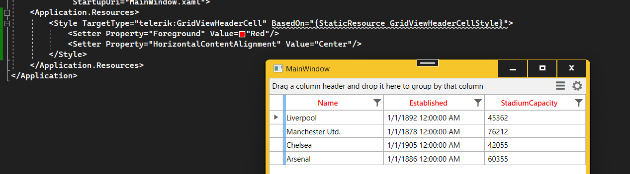<Style TargetType="telerik:GridViewHeaderCell" BasedOn="{StaticResource GridViewHeaderCellStyle}"> <Setter Property="Foreground" Value="Red"/> <Setter Property="HorizontalContentAlignment" Value="Center"/> </Style>