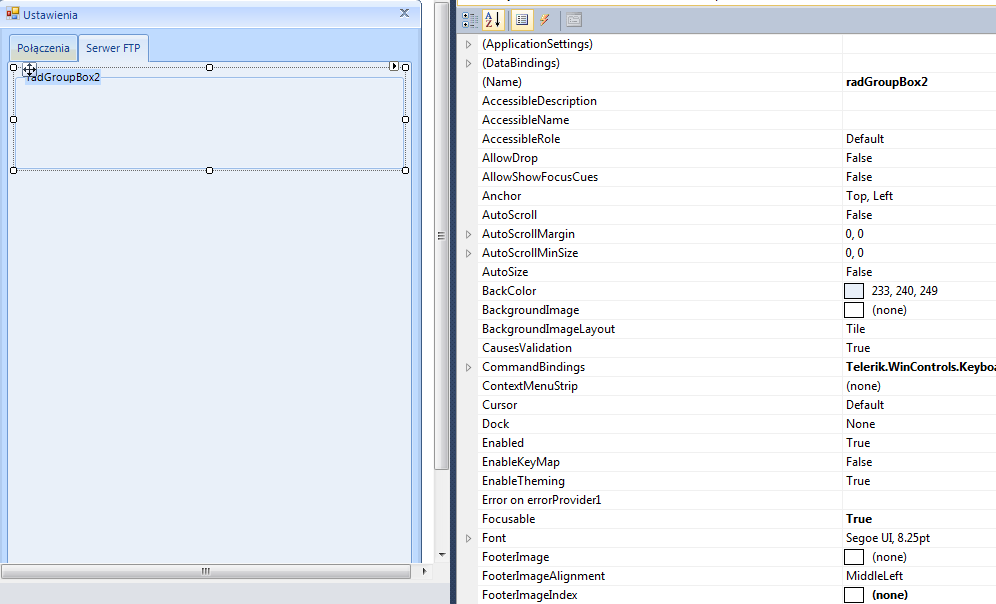 I have RadGroupBox control placed on RadPageView. The problem is with RadGroupBox colors: in desing mode everything is ok (see desinger.PNG from atachement), but when I run my application, the BackColor of RagGroupBox seems to be from main form instead of PadPage (see running.PNG), so it looks strange.