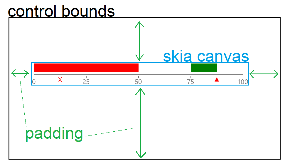 Here you can see that the control is quite large (black bounds). The Padding is marked with green arrows. The intention of the padding is for this area to be empty, with no things in it, so that items on screen can be presented clearly. The padding is intended to be on the inside of the control as opposed to the Margin which is empty space outside of the bounds of the control. The blue rectangle denotes where the skia canvas is. The skia canvas is what we use to draw the gauge elements in. It is a SkiaSharp element and it is not possible to draw outside of its bounds. So if you were to add a large annotation at the 0 value, it will get clipped just as before.