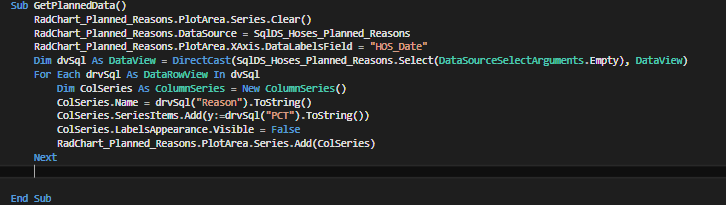 I have successfully got my Radhtmlchart dynamically creating column series based on some data coming from a SQLDataSource (using VB.net). However, the sql data structure (see attachment below) requires the data to be split across an x axis datetime and my series seems to be just adding the series into the first date value regardless of the value in the sql table. I am obviously doing something wrong here (possibly with my table structure or the code).