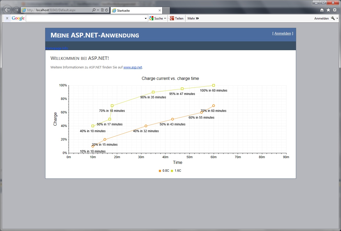 <asp:Content ID="Content1" ContentPlaceHolderID="MainContentPlace" runat="server"> <telerik:RadScriptManager ID="TrsmScriptManager" runat="server"> </telerik:RadScriptManager> <telerik:RadAjaxManager ID="RadAjaxManager1" runat="server"> </telerik:RadAjaxManager> <h1> Testing</h1> <telerik:RadHtmlChart runat="server" ID="ScatterLineChart1" Transitions="true"> <PlotArea> <Series> <telerik:ScatterLineSeries Name="0.8C" MissingValues="Gap"> <LabelsAppearance DataFormatString="{1}% in {0} minutes" Position="Below" /> <MarkersAppearance MarkersType="Circle" /> <SeriesItems> <telerik:ScatterSeriesItem X="10" Y="10" /> <telerik:ScatterSeriesItem X="15" Y="20" /> <telerik:ScatterSeriesItem /> <telerik:ScatterSeriesItem X="32" Y="40" /> <telerik:ScatterSeriesItem X="43" Y="50" /> <telerik:ScatterSeriesItem X="55" Y="60" /> <telerik:ScatterSeriesItem X="60" Y="70" /> </SeriesItems> </telerik:ScatterLineSeries> <telerik:ScatterLineSeries Name="1.6C"> <LabelsAppearance DataFormatString="{1}% in {0} minutes" Position="Below" /> <MarkersAppearance MarkersType="Square" /> <SeriesItems> <telerik:ScatterSeriesItem X="10" Y="40" /> <telerik:ScatterSeriesItem X="17" Y="50" /> <telerik:ScatterSeriesItem X="18" Y="70" /> <telerik:ScatterSeriesItem X="35" Y="90" /> <telerik:ScatterSeriesItem X="47" Y="95" /> <telerik:ScatterSeriesItem X="60" Y="100" /> </SeriesItems> </telerik:ScatterLineSeries> </Series> <XAxis AxisCrossingValue="0" Color="Black" MajorTickType="Outside" MinorTickType="Outside" Reversed="false" MinValue="0" MaxValue="90" Step="10"> <LabelsAppearance DataFormatString="{0}m" RotationAngle="0" /> <MajorGridLines Color="#EFEFEF" Width="1" /> <MinorGridLines Color="#F7F7F7" Width="1" /> <TitleAppearance Position="Center" RotationAngle="0" Text="Time" /> </XAxis> <YAxis AxisCrossingValue="0" Color="Black" MajorTickSize="1" MajorTickType="Outside" MaxValue="100" MinorTickSize="1" MinorTickType="Outside" MinValue="0" Reversed="false" Step="20"> <LabelsAppearance DataFormatString="{0}%" RotationAngle="0" /> <MajorGridLines Color="#EFEFEF" Width="1" /> <MinorGridLines Color="#F7F7F7" Width="1" /> <TitleAppearance Position="Center" RotationAngle="0" Text="Charge" /> </YAxis> </PlotArea> <ChartTitle Text="Charge current vs. charge time"> </ChartTitle> <Legend> <Appearance Position="Bottom" /> </Legend> </telerik:RadHtmlChart></asp:Content>What do i do wrong?