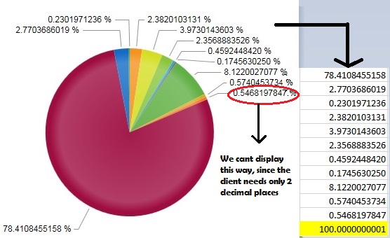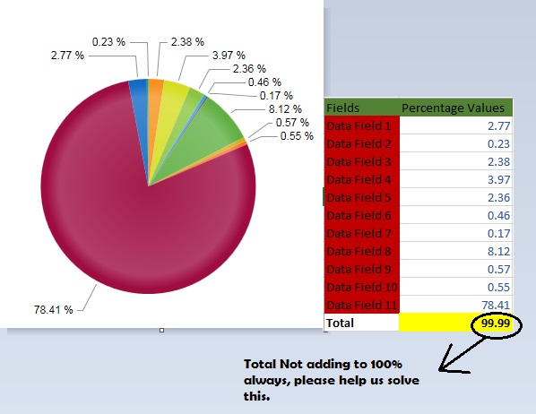 I'm working with Radhtmlchart, and the label appearance's total addition of all data fields is not 100%, its always less than 100% like 99.6 or 99.7 or 99.99, but not 100%. Could you please help us in this regard. We have used the following code to add up the items and display the value in terms of percentage.