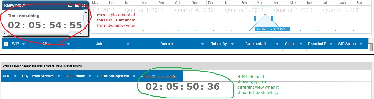 I have attached screenshots showing the initial view (where the HTML element is inside the RadWindow) and another view (where the HTML element just shows on the middle of the screen, when it should not show at all).