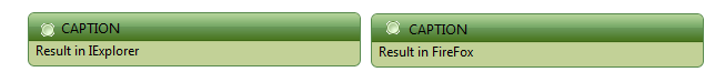 <telerik:RadDockZone ID="RadDockZoneTest" Runat="server" Width="300px" BorderStyle="None" Skin="Forest"> <telerik:RadDock ID="RadDock4" Runat="server" Width="300px" DefaultCommands="None" EnableDrag="False" EnableRoundedCorners="True" Skin="Forest"> <TitlebarTemplate> <table style="width:100%;"> <tr> <td style="vertical-align: middle; width: 20px;"> <telerik:RadButton ID="rbtnReport" runat="server" AutoPostBack="False" ButtonType="ToggleButton" Text="" ToggleType="Radio" Skin="Forest"> </telerik:RadButton> </td> <td style="vertical-align: middle"> <asp:Label ID="Label7" runat="server" Text="CAPTION" Font-Names="Segoe UI" Font-Size="10pt"></asp:Label> </td> </tr> </table> </TitlebarTemplate> <ContentTemplate> <asp:Label ID="Label8" runat="server" Text="Result in IExplorer"></asp:Label> </ContentTemplate> </telerik:RadDock> </telerik:RadDockZone>I attach a screen capture with the result in the two browsers.