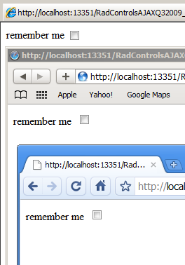 <!DOCTYPE html PUBLIC "-//W3C//DTD XHTML 1.0 Transitional//EN" "http://www.w3.org/TR/xhtml1/DTD/xhtml1-transitional.dtd"><html xmlns="http://www.w3.org/1999/xhtml"><head runat="server"> <title></title> <style type="text/css"> .rfdRadio input[type="radio"], .rfdCheckbox input[type="checkbox"] { -webkit-appearance: none; } </style></head><body style="padding-right: 0px; padding-left: 0px; padding-bottom: 0px; margin: 0px; padding-top: 0px;"> <form id="Telerik" runat="server"> <telerik:RadScriptManager ID="RadScriptManager1" runat="server"> </telerik:RadScriptManager> <telerik:RadFormDecorator ID="RadFormDecorator1" runat="server" DecoratedControls="All" EnableRoundedCorners="true" Skin="Office2010Black" /> <asp:CheckBox ID="chb1" runat="server" Text="Google Chrome" /> <asp:RadioButton ID="rb1" runat="server" Text="Google Chrome" /> </form></body></html>All the best,