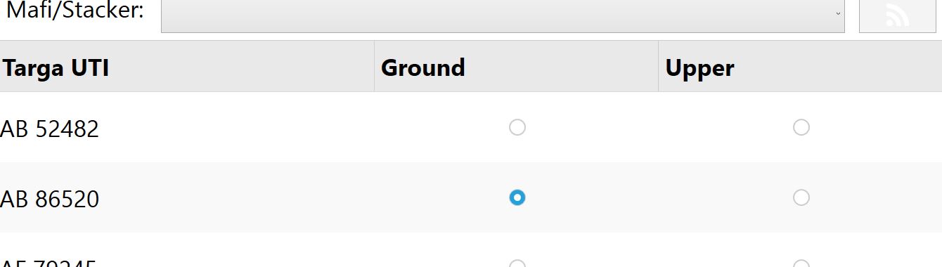I have a grid that contains a list of "container" (they could be one, 2 or more). So every row has a plate(with an id) and 2 radio button (ground - Upper). I retrieve the value of these radiobutton from the DB. Radio button Ground is selected when the variable IsUtiInDoubleStakerHold == 0. If IsUtiInDoubleStakerHold == 1radiobutton Upper has to be selected; if radiobutton Ground is selected, radiobutton Upper cannot be selected and vice versa. For every row I need to select a radio button, and then I have to save the value eventually modified. How can I do this? Actually with this code if I do a choice of a value in the first row, then when I make a selection on the second row, I lost the value of the radiobutton selected in the first row (I can't see anymore the selection done before).