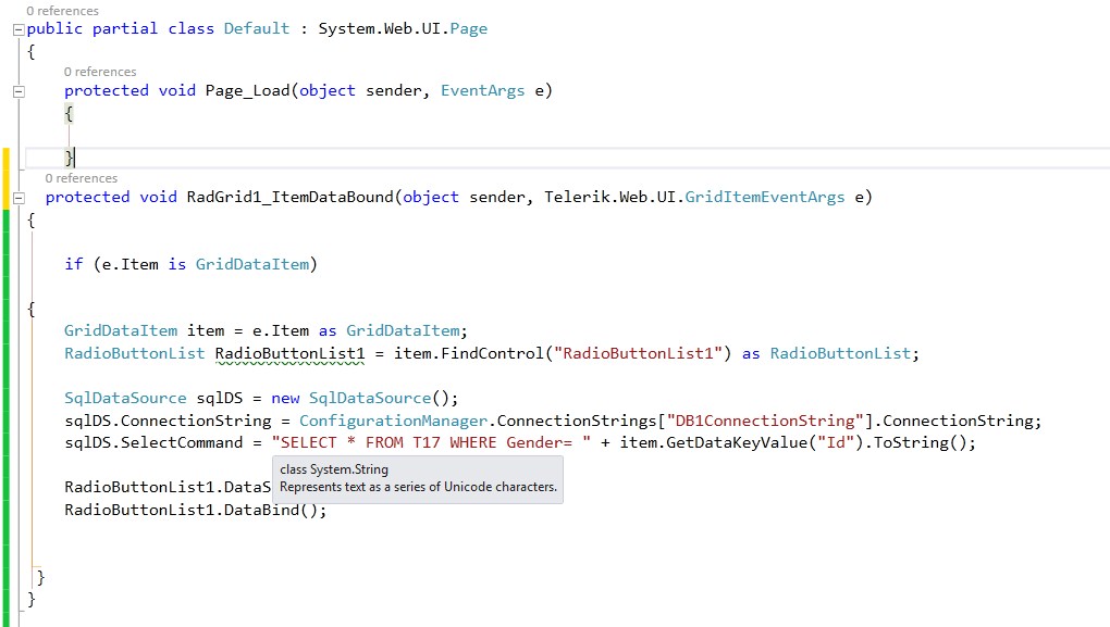 <MasterTableView DataKeyNames="QuestionId"></MasterTableView>protected void RadGrid1_ItemDataBound(object sender, Telerik.Web.UI.GridItemEventArgs e) { if (e.Item is GridDataItem) { GridDataItem item = e.Item as GridDataItem; RadioButtonList rblAnswer = item.FindControl("rblAnswer") as RadioButtonList; SqlDataSource sqlDS = new SqlDataSource(); sqlDS.ConnectionString = "your conncetion string"; sqlDS.SelectCommand = "select * from Table1 Where QuestionId =" + item.GetDataKeyValue("QuestionId").ToString(); rblAnswer.DataSource = sqlDS;................... } }Thanks,
