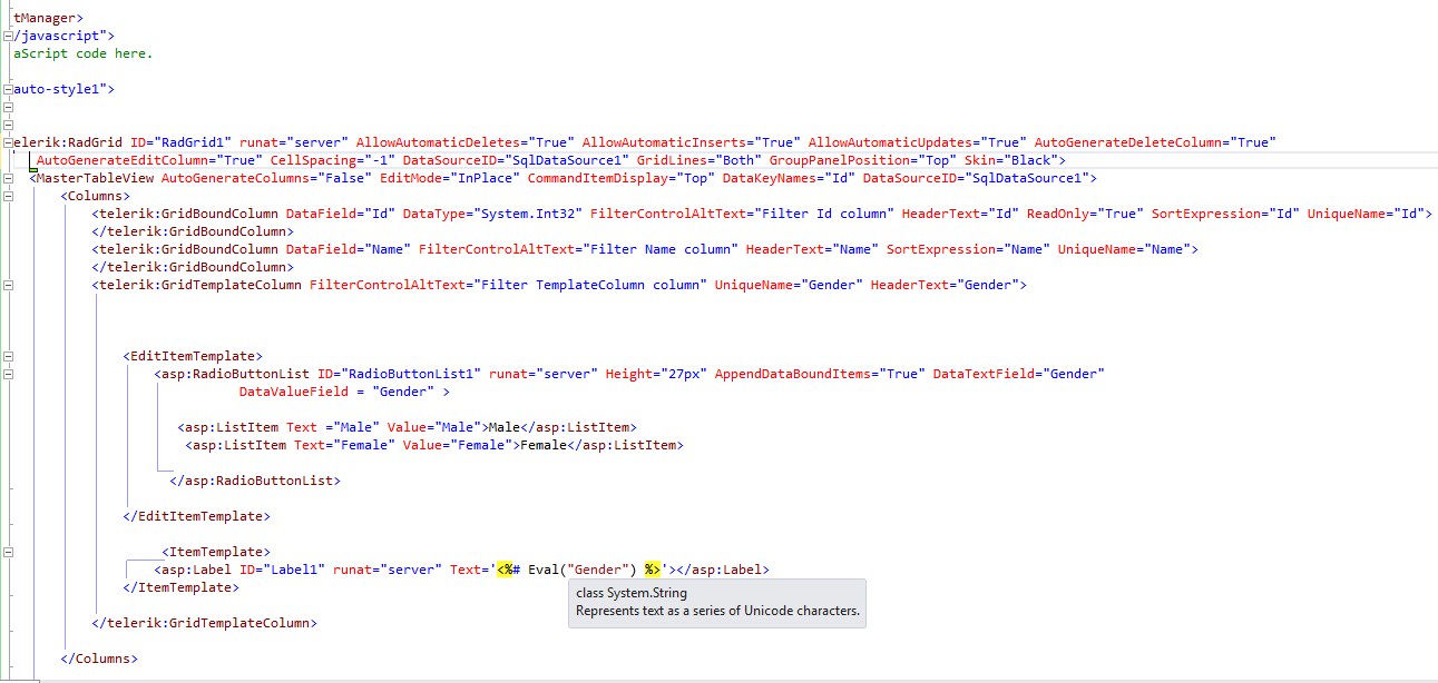 <telerik:RadGrid ID="rgQuestionary" runat="server" CellSpacing="0" DataSourceID="sqlManufacturerSurvey" ..... <Columns> <telerik:GridBoundColumn DataField="Question" FilterControlAltText="Filter Question column" HeaderText="Question" UniqueName="Question"> </telerik:GridBoundColumn> <telerik:GridTemplateColumn FilterControlAltText="Filter column column" UniqueName="Answer" HeaderText="Answer"> <ItemTemplate> <asp:RadioButtonList ID="rblAnswer" runat="server" DataTextField="Answer" DataValueField="AnswerID" RepeatLayout="Flow" BorderWidth="0"> </asp:RadioButtonList> </ItemTemplate> </telerik:GridTemplateColumn> <telerik:GridBoundColumn DataField="QuestionID" FilterControlAltText="Filter QuestionID column" HeaderText="QuestionID" UniqueName="QuestionID" Visible="False"> </telerik:GridBoundColumn> </Columns>