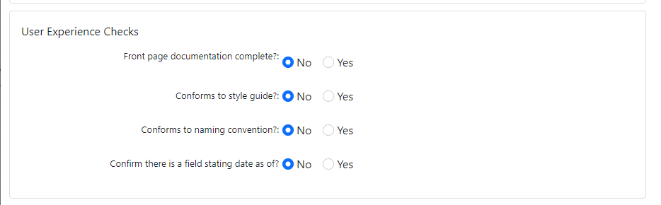 I have a form with quite a few yes/no radio button groups, split up into sections with divs (bootstrap cards). Each radiobutton is horizontally aligned, and has a label in the form of a span before it.