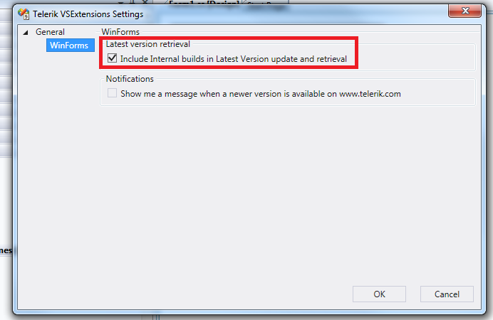 Additionally, note that you need to enable the "Include Internal Builds" option from the options menu first (documentation: http://www.telerik.com/help/winforms/installation-deployment-and-distribution-vsx-options-dialog.html)