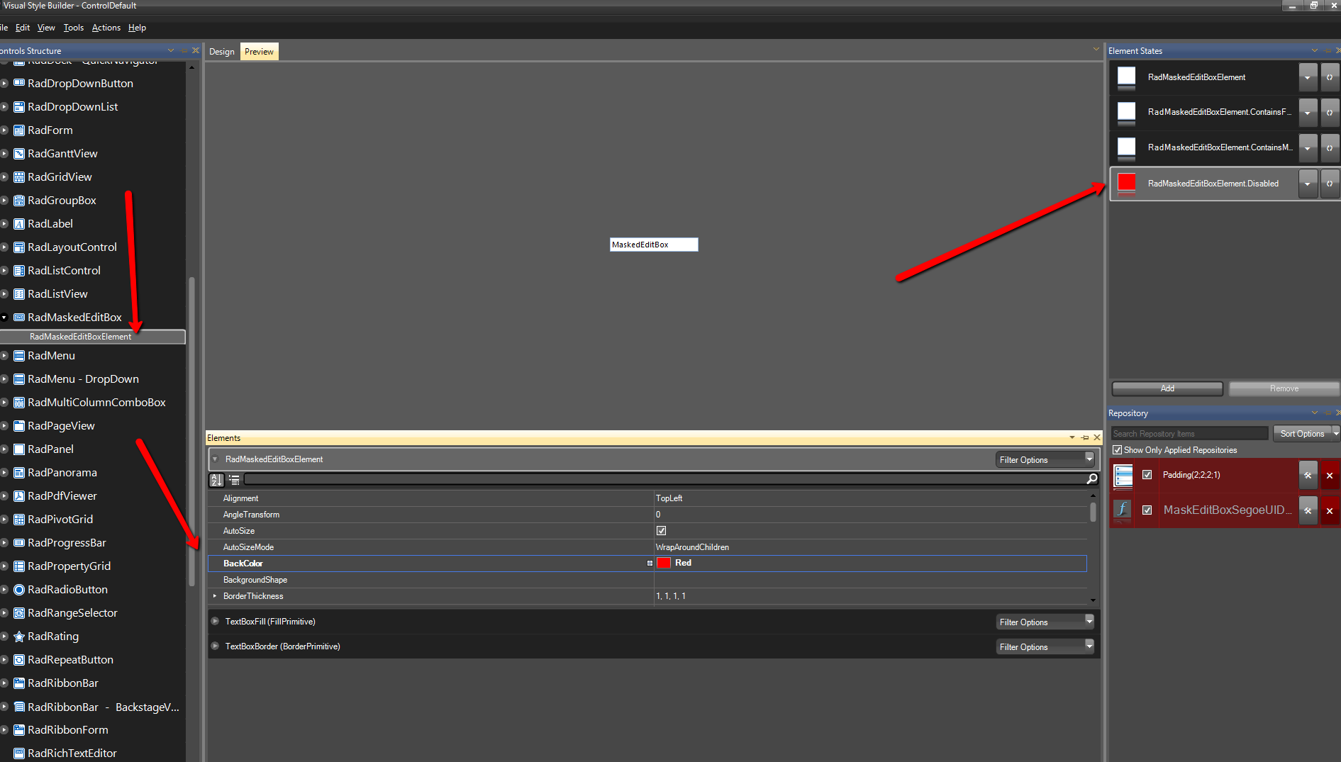 Color disableColor;private void maskedTextBox_EnabledChanged(object sender, EventArgs e){ if (!this.maskedTextBox.Enabled) { //Set disable color the same as the label text color this.radLabel.LabelElement.VisualState = "RadLabelElement.Disabled"; disableColor = this.radLabel.LabelElement.ForeColor; //Change the backcolor of the maskedtextbox this.maskedTextBox.MaskedEditBoxElement.TextBoxItem.BackColor = disableColor; } else { //Reset values } } }