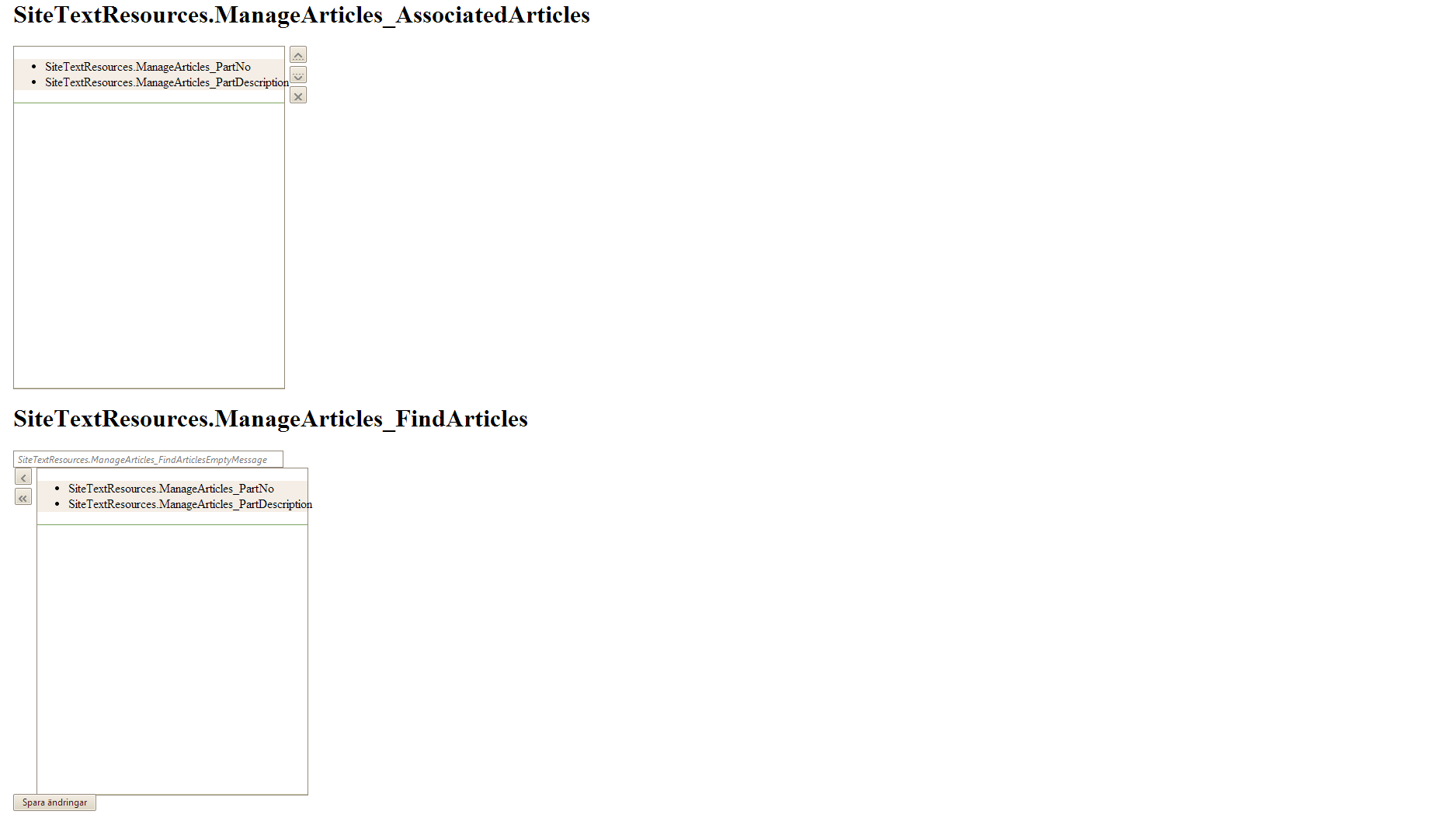 <asp:Panel runat="server" ID="ManageBalancePartsPanel" ClientIDMode="Static" CssClass="manage-balance-parts"> <asp:Panel runat="server" CssClass="left-section"> <h1><asp:Literal runat="server" Text="<%$ Resx:SiteTextResources.ManageArticles_AssociatedArticles %>" /></h1> <telerik:RadListBox runat="server" ID="ConnectedBalancePartsListBox" Height="440px" Width="380px" AllowReorder="true" SelectionMode="Multiple" OnItemDataBound="OnConnectedBalancePartsDataBound" AllowDelete="true" Localization-MoveDown="<%$ Resx:SiteTextResources.ManageArticles_MoveArticlesDown %>" Localization-MoveUp="<%$ Resx:SiteTextResources.ManageArticles_MoveArticlesUp %>" Localization-Delete="<%$ Resx:SiteTextResources.ManageArticles_RemoveSelectedArticles %>"> <ButtonSettings ShowDelete="true" /> <HeaderTemplate> <ul class="list-header"> <li class="part-number-column"><asp:Literal runat="server" Text="<%$ Resx:SiteTextResources.ManageArticles_PartNo %>" /></li> <li class="part-description-column"><asp:Literal runat="server" Text="<%$ Resx:SiteTextResources.ManageArticles_PartDescription %>" /></li> </ul> </HeaderTemplate> <ItemTemplate> <ul> <li class="part-number-column"><%# Eval("PartNo") %></li> <li class="part-description-column"><%# Eval("Description") %></li> </ul> </ItemTemplate> </telerik:RadListBox> </asp:Panel> <asp:Panel runat="server" CssClass="right-section"> <h1><asp:Literal runat="server" Text="<%$ Resx:SiteTextResources.ManageArticles_FindArticles %>" /></h1> <div class="search-articles-wrapper"> <telerik:RadTextBox runat="server" Width="348px" ID="BalancePartsFilterTextBox" ClientIDMode="Static" CssClass="search-articles-input" EmptyMessage="<%$ Resx:SiteTextResources.ManageArticles_FindArticlesEmptyMessage %>" /> <div id="suggestions"></div> </div> <div> <telerik:RadListBox ID="BalancePartsFilterResultsListBox" runat="server" Width="380px" Height="420px" EnableDragAndDrop="true" AllowReorder="false" AllowTransfer="true" TransferToID="ConnectedBalancePartsListBox" AutoPostBackOnTransfer="true" SelectionMode="Multiple" TransferMode="Move" OnTransferred="OnBalancePartsTransferred" OnTransferring="OnBalancePartsTransferring" OnItemDataBound="OnFilterBalancePartsDataBound" Localization-ToLeft="<%$ Resx:SiteTextResources.ManageArticles_AssociateSelectedArticle %>" Localization-AllToLeft="<%$ Resx:SiteTextResources.ManageArticles_AssociateAllArticles %>"> <ButtonSettings ShowReorder="false" Position="Left" TransferButtons="TransferFrom, TransferAllFrom" /> <HeaderTemplate> <ul class="list-header"> <li class="part-number-column"><asp:Literal runat="server" Text="<%$ Resx:SiteTextResources.ManageArticles_PartNo %>" /></li> <li class="part-description-column"><asp:Literal runat="server" Text="<%$ Resx:SiteTextResources.ManageArticles_PartDescription %>" /></li> </ul> </HeaderTemplate> <ItemTemplate> <ul> <li class="part-number-column"><%# Eval("PartNo") %></li> <li class="part-description-column"><%# Eval("Description") %></li> </ul> </ItemTemplate> </telerik:RadListBox> </div> </asp:Panel> <div class="clear"></div> <telerik:RadButton runat="server" Text="Spara ändringar" ID="SaveChangesButton" OnClick="SaveChangesClick" CssClass="save-changes-button" /> </asp:Panel>0