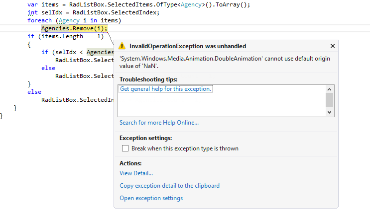 <Window xmlns:telerik="http://schemas.telerik.com/2008/xaml/presentation" x:Class="RadListBoxTest.MainWindow" Title="MainWindow" Height="500" Width="800" > <Window.Resources> <ResourceDictionary> <ResourceDictionary.MergedDictionaries> <ResourceDictionary Source="Brushes.xaml"/> <ResourceDictionary Source="RadListBoxStyle.xaml"/> </ResourceDictionary.MergedDictionaries> </ResourceDictionary> </Window.Resources> <Grid> <telerik:RadListBox x:Name="RadListBox" ItemsSource="{Binding Assemblies}" SelectedIndex="0" SelectionMode="Extended" AllowDrop="True" Margin="0,0,0,69"/> <Button Content="Add Items" HorizontalAlignment="Center" VerticalAlignment="Bottom" Width="150" Height="30" Margin="246,0,396,0" Click="Button_Click_2"/> <Button Content="Remove Selected Items" HorizontalAlignment="Center" VerticalAlignment="Bottom" Width="150" Height="30" Click="Button_Click_1" Margin="463,0,179,0"/> </Grid></Window>public partial class MainWindow : Window{ public MainWindow() { InitializeComponent(); RadListBox.ItemsSource = Agencies; } private ObservableCollection<Agency> agencies; public ObservableCollection<Agency> Agencies { get { if (agencies == null) { agencies = new ObservableCollection<Agency>(); } return agencies; } } private void Button_Click_1(object sender, RoutedEventArgs e) { if (RadListBox.SelectedItems != null && RadListBox.SelectedItems.Count > 0) { var items = RadListBox.SelectedItems.OfType<Agency>().ToArray(); int selIdx = RadListBox.SelectedIndex; foreach (Agency i in items) Agencies.Remove(i); if (items.Length == 1) { if (selIdx < Agencies.Count) RadListBox.SelectedIndex = selIdx; else RadListBox.SelectedIndex = Agencies.Count - 1; } else RadListBox.SelectedIndex = Agencies.Count - 1; } } private void Button_Click_2(object sender, RoutedEventArgs e) { agencies.Add(new Agency("Exotic Liquids", "(171) 555-2222", "EC1 4SD")); agencies.Add(new Agency("New Orleans Cajun Delights", "(100) 555-4822", "70117")); agencies.Add(new Agency("Grandma Kelly's Homestead", "(313) 555-5735", "48104")); agencies.Add(new Agency("Tokyo Traders", "(03) 3555-5011", "100")); agencies.Add(new Agency("Cooperativa de Quesos 'Las Cabras'", "(98) 598 76 54", "33007")); agencies.Add(new Agency("Mayumi's", "(06) 431-7877", "545")); agencies.Add(new Agency("Pavlova, Ltd.", "(03) 444-2343", "3058")); agencies.Add(new Agency("Specialty Biscuits, Ltd.", "(161) 555-4448", "M14 GSD")); agencies.Add(new Agency("PB Knäckebröd AB", "031-987 65 43", "S-345 67")); agencies.Add(new Agency("Refrescos Americanas LTDA", "(11) 555 4640", "5442")); }}