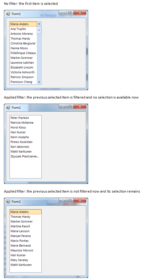 After initial loading of the RadListControl (DataSource property is set to Customers data table) the first item in the collection is selected -> normal behaviour. In case of applying a filter, no selection is available if the previous selected item is available in the filtered collection. Otherwise, the selection remains. Please see the attached picture. This is normal behaviour of RadListControl. If you want to remove the selection every time a filter is applied you may set the SelectedIndex property of the control to -1.