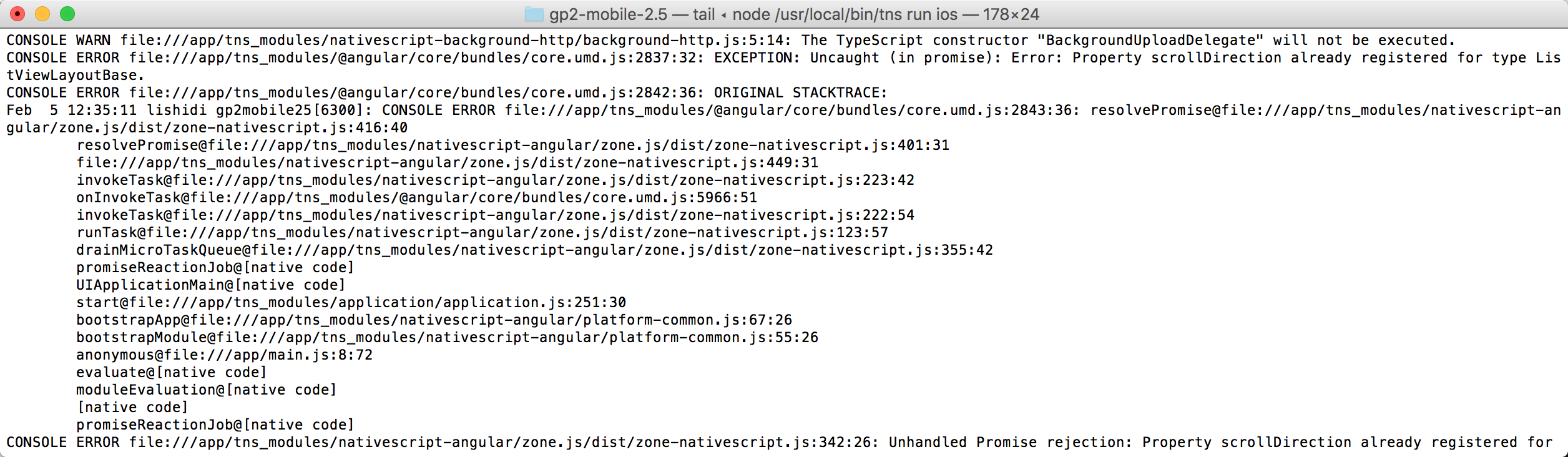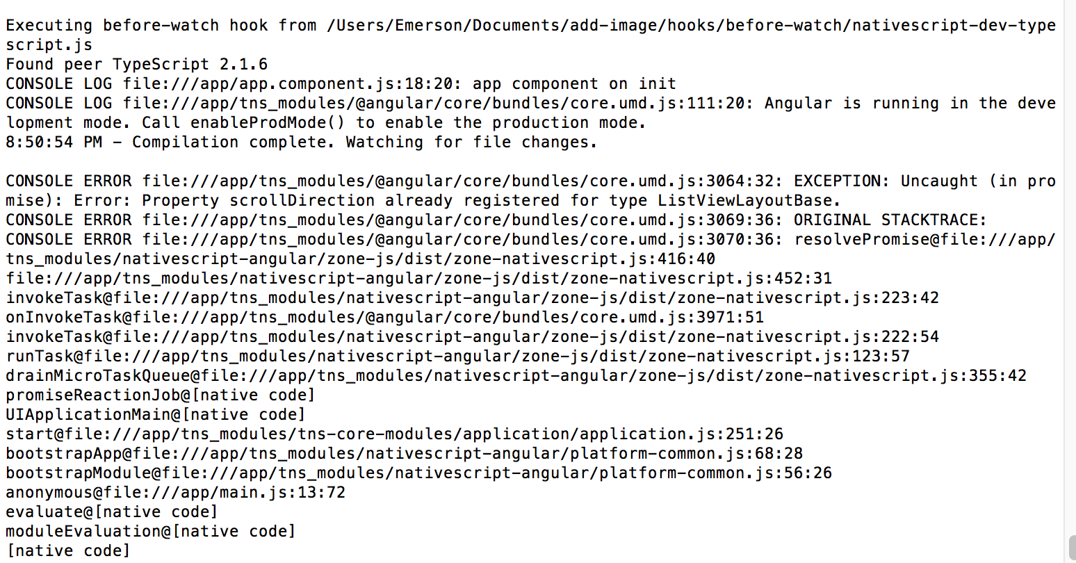 CONSOLE ERROR file:///app/tns_modules/nativescript-angular/zone-js/dist/zone-nativescript.js:342:26: Unhandled Promise rejection: Property scrollDirection already registered for type ListViewLayoutBase. ; Zone: angular ; Task: Promise.then ; Value: Error: Property scrollDirection already registered for type ListViewLayoutBase. Property@file:///app/tns_modules/tns-core-modules/ui/core/dependency-observable.js:73:28