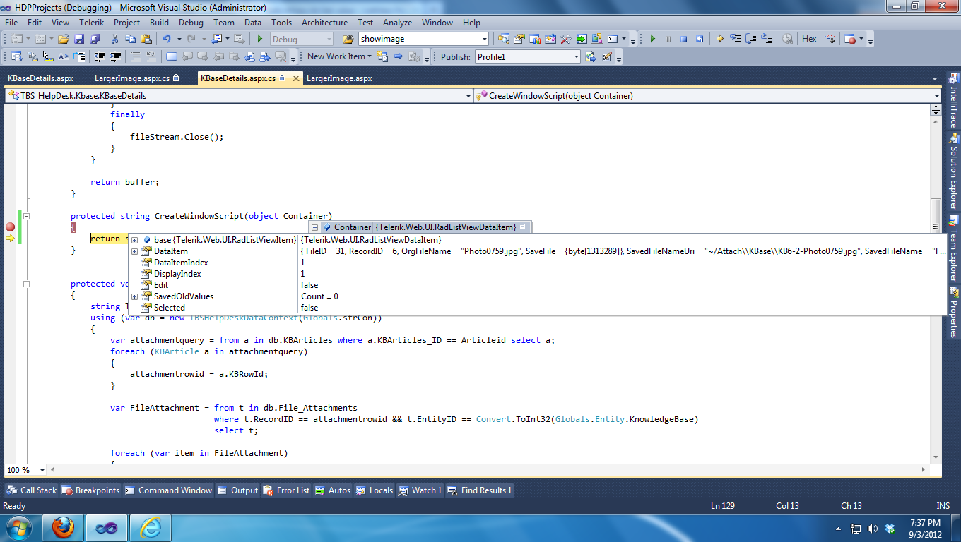 protected string CreateWindowScript(){ //return string.Format("var win = window.radopen('LargerImage.aspx?id={0}','Details');win.center();", attachmentrowid); return string.Format("ShowImage('" + attachmentrowid + "');");}function ShowImage(arg) { var RadWindow = $find("<%=Details.ClientID%>"); RadWindow.setUrl("LargerImage.aspx?id=" + arg); RadWindow.show(); false; }Thanks Advance,