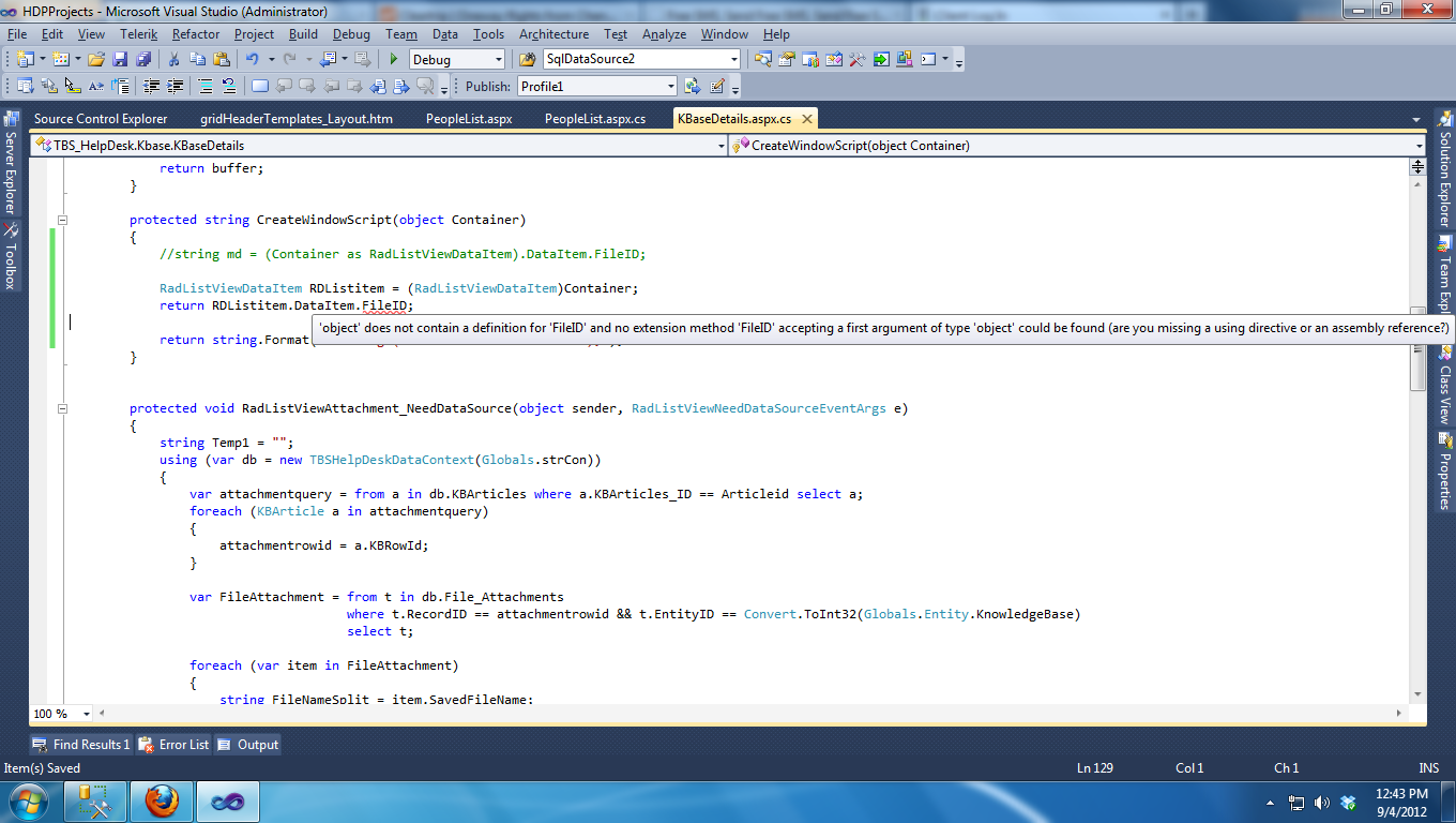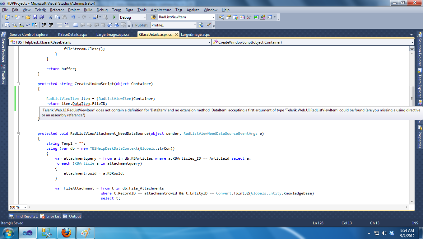 RadListViewDataItem RDListitem = (RadListViewDataItem)Container;//return RDListitem.DataItem.FileID;string Val = RDListitem.DataItem.ToString();string File = Val.Substring(11, 5);string[] FileIDArray = File.Split(',');string FileI = FileIDArray[0]; return string.Format("ShowImage('" + FileI + "');");Thanks Advance ,