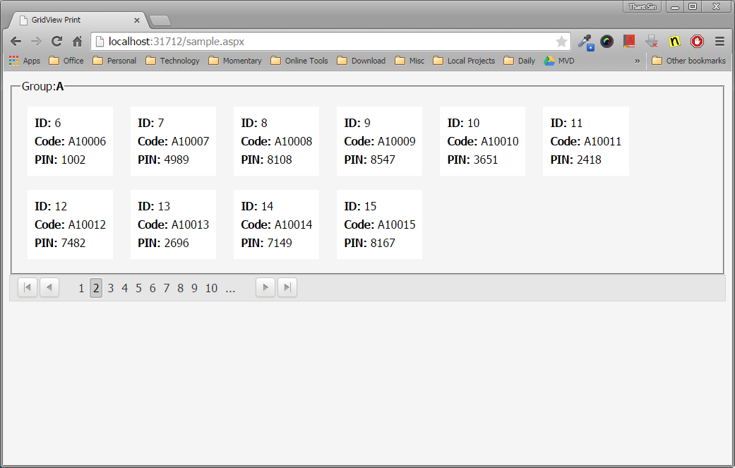<telerik:RadAjaxPanel ID="RadAjaxPanel1" runat="server"> <telerik:RadListView ID="RadListView1" runat="server" ItemPlaceholderID="DataGroupPlaceHolder3" OnNeedDataSource="RadListView1_NeedDataSource" AllowPaging="True" GroupAggregatesScope="AllItems" DataKeyNames="ID"> <ItemTemplate> <div style="display: inline-block; background-color: white; padding: 10px; margin: 10px;"> <div> <b>ID: </b> <%#Eval("ID")%> </div> <div class="category model"> <b>Code: </b> <%#Eval("Code")%> </div> <div class="category"> <b>PIN: </b> <%#Eval("PIN")%> </div> </div> </ItemTemplate> <LayoutTemplate> <asp:Panel ID="DataGroupPlaceHolder2" runat="server"> </asp:Panel> <telerik:RadDataPager ID="RadDataPager1" runat="server" PagedControlID="RadListView1" Skin="Silk" PageSize="5" class="clearfix"> <Fields> <telerik:RadDataPagerButtonField FieldType="FirstPrev" FirstButtonText="First" PrevButtonText="Prev"></telerik:RadDataPagerButtonField> <telerik:RadDataPagerButtonField FieldType="Numeric" PageButtonCount="10"></telerik:RadDataPagerButtonField> <telerik:RadDataPagerButtonField FieldType="NextLast" NextButtonText="Next" LastButtonText="Last"></telerik:RadDataPagerButtonField> </Fields> </telerik:RadDataPager> </LayoutTemplate> <GroupSeparatorTemplate> </GroupSeparatorTemplate> <DataGroups> <telerik:ListViewDataGroup GroupField="Group" DataGroupPlaceholderID="DataGroupPlaceHolder2" SortOrder="Ascending"> <DataGroupTemplate> <asp:Panel runat="server" ID="Panel3" GroupingText='<%# "Group:<b>" + (Container as RadListViewDataGroupItem).DataGroupKey + "</b>"%> '> <asp:PlaceHolder runat="server" ID="DataGroupPlaceHolder3"></asp:PlaceHolder> </asp:Panel> </DataGroupTemplate> <GroupAggregates> <telerik:ListViewDataGroupAggregate Aggregate="First" DataField="Group" /> </GroupAggregates> </telerik:ListViewDataGroup> </DataGroups> </telerik:RadListView></telerik:RadAjaxPanel>
