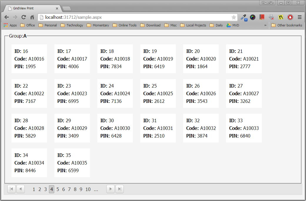 protected void RadListView1_NeedDataSource(object sender, Telerik.Web.UI.RadListViewNeedDataSourceEventArgs e){ RadListView1.DataSource = PrepareData();}private DataTable PrepareData(){ DataTable l_Table = new DataTable(); l_Table.Columns.Add("ID"); l_Table.Columns.Add("Code"); l_Table.Columns.Add("Group"); l_Table.Columns.Add("PIN"); l_Table.Rows.Add(new object[] { 1, "A10001", "A", 8096 }); l_Table.Rows.Add(new object[] { 2, "A10002", "A", 3029 }); l_Table.Rows.Add(new object[] { 3, "A10003", "A", 9427 }); l_Table.Rows.Add(new object[] { 4, "A10004", "A", 8792 }); l_Table.Rows.Add(new object[] { 5, "A10005", "A", 7166 }); l_Table.Rows.Add(new object[] { 6, "A10006", "A", 1002 }); l_Table.Rows.Add(new object[] { 7, "A10007", "A", 4989 }); l_Table.Rows.Add(new object[] { 8, "A10008", "A", 8108 }); l_Table.Rows.Add(new object[] { 9, "A10009", "A", 8547 }); l_Table.Rows.Add(new object[] { 10, "A10010", "A", 3651 }); l_Table.Rows.Add(new object[] { 11, "A10011", "A", 2418 }); l_Table.Rows.Add(new object[] { 12, "A10012", "A", 7482 }); l_Table.Rows.Add(new object[] { 13, "A10013", "A", 2696 }); l_Table.Rows.Add(new object[] { 14, "A10014", "A", 7149 }); l_Table.Rows.Add(new object[] { 15, "A10015", "A", 8167 }); l_Table.Rows.Add(new object[] { 16, "A10016", "A", 1995 }); l_Table.Rows.Add(new object[] { 17, "A10017", "A", 4006 }); l_Table.Rows.Add(new object[] { 18, "A10018", "A", 7834 }); l_Table.Rows.Add(new object[] { 19, "A10019", "A", 6419 }); l_Table.Rows.Add(new object[] { 20, "A10020", "A", 1864 }); l_Table.Rows.Add(new object[] { 21, "A10021", "A", 2777 }); l_Table.Rows.Add(new object[] { 22, "A10022", "A", 7167 }); l_Table.Rows.Add(new object[] { 23, "A10023", "A", 6995 }); l_Table.Rows.Add(new object[] { 24, "A10024", "A", 7136 }); l_Table.Rows.Add(new object[] { 25, "A10025", "A", 2612 }); l_Table.Rows.Add(new object[] { 26, "A10026", "A", 3543 }); l_Table.Rows.Add(new object[] { 27, "A10027", "A", 3262 }); l_Table.Rows.Add(new object[] { 28, "A10028", "A", 5829 }); l_Table.Rows.Add(new object[] { 29, "A10029", "A", 3409 }); l_Table.Rows.Add(new object[] { 30, "A10030", "A", 6428 }); l_Table.Rows.Add(new object[] { 31, "A10031", "A", 2510 }); l_Table.Rows.Add(new object[] { 32, "A10032", "A", 3874 }); l_Table.Rows.Add(new object[] { 33, "A10033", "A", 6840 }); l_Table.Rows.Add(new object[] { 34, "A10034", "A", 8446 }); l_Table.Rows.Add(new object[] { 35, "A10035", "A", 6599 }); l_Table.Rows.Add(new object[] { 36, "A10036", "A", 9215 }); l_Table.Rows.Add(new object[] { 37, "A10037", "A", 8140 }); l_Table.Rows.Add(new object[] { 38, "A10038", "A", 9804 }); l_Table.Rows.Add(new object[] { 39, "A10039", "A", 9179 }); l_Table.Rows.Add(new object[] { 40, "A10040", "A", 7315 }); l_Table.Rows.Add(new object[] { 41, "B10001", "B", 9307 }); l_Table.Rows.Add(new object[] { 42, "B10002", "B", 6832 }); l_Table.Rows.Add(new object[] { 43, "B10003", "B", 2386 }); l_Table.Rows.Add(new object[] { 44, "B10004", "B", 2283 }); l_Table.Rows.Add(new object[] { 45, "B10005", "B", 3295 }); l_Table.Rows.Add(new object[] { 46, "B10006", "B", 6314 }); l_Table.Rows.Add(new object[] { 47, "B10007", "B", 1433 }); l_Table.Rows.Add(new object[] { 48, "B10008", "B", 2250 }); l_Table.Rows.Add(new object[] { 49, "B10009", "B", 1658 }); l_Table.Rows.Add(new object[] { 50, "B10010", "B", 4967 }); l_Table.Rows.Add(new object[] { 51, "B10011", "B", 6391 }); l_Table.Rows.Add(new object[] { 52, "B10012", "B", 6217 }); l_Table.Rows.Add(new object[] { 53, "B10013", "B", 5478 }); l_Table.Rows.Add(new object[] { 54, "B10014", "B", 2037 }); l_Table.Rows.Add(new object[] { 55, "B10015", "B", 3961 }); l_Table.Rows.Add(new object[] { 56, "B10016", "B", 8989 }); l_Table.Rows.Add(new object[] { 81, "C10001", "C", 5405 }); l_Table.Rows.Add(new object[] { 82, "C10002", "C", 9161 }); l_Table.Rows.Add(new object[] { 83, "C10003", "C", 7635 }); l_Table.Rows.Add(new object[] { 84, "C10004", "C", 4567 }); l_Table.Rows.Add(new object[] { 85, "C10005", "C", 1197 }); l_Table.Rows.Add(new object[] { 86, "C10006", "C", 3379 }); l_Table.Rows.Add(new object[] { 87, "C10007", "C", 4782 }); l_Table.Rows.Add(new object[] { 88, "C10008", "C", 5650 }); l_Table.Rows.Add(new object[] { 89, "C10009", "C", 7737 }); l_Table.Rows.Add(new object[] { 90, "C10010", "C", 7174 }); l_Table.Rows.Add(new object[] { 91, "C10011", "C", 8038 }); l_Table.Rows.Add(new object[] { 92, "C10012", "C", 1445 }); l_Table.Rows.Add(new object[] { 93, "C10013", "C", 9798 }); l_Table.Rows.Add(new object[] { 94, "C10014", "C", 6405 }); l_Table.Rows.Add(new object[] { 95, "C10015", "C", 2384 }); l_Table.Rows.Add(new object[] { 96, "C10016", "C", 3403 }); l_Table.Rows.Add(new object[] { 97, "C10017", "C", 6483 }); l_Table.Rows.Add(new object[] { 98, "C10018", "C", 8907 }); l_Table.Rows.Add(new object[] { 99, "C10019", "C", 5507 }); l_Table.Rows.Add(new object[] { 100, "C10020", "C", 4660 }); l_Table.Rows.Add(new object[] { 101, "C10021", "C", 9608 }); l_Table.Rows.Add(new object[] { 102, "C10022", "C", 5091 }); l_Table.Rows.Add(new object[] { 103, "C10023", "C", 7184 }); l_Table.Rows.Add(new object[] { 127, "D10001", "D", 5775 }); l_Table.Rows.Add(new object[] { 128, "D10002", "D", 6340 }); l_Table.Rows.Add(new object[] { 129, "D10003", "D", 1671 }); l_Table.Rows.Add(new object[] { 130, "D10004", "D", 2434 }); l_Table.Rows.Add(new object[] { 131, "D10005", "D", 2740 }); l_Table.Rows.Add(new object[] { 132, "D10006", "D", 5798 }); l_Table.Rows.Add(new object[] { 133, "D10007", "D", 5826 }); l_Table.Rows.Add(new object[] { 134, "D10008", "D", 6959 }); l_Table.Rows.Add(new object[] { 135, "D10009", "D", 2469 }); l_Table.Rows.Add(new object[] { 136, "D10010", "D", 6864 }); l_Table.Rows.Add(new object[] { 137, "D10011", "D", 8379 }); l_Table.Rows.Add(new object[] { 138, "D10012", "D", 8301 }); l_Table.Rows.Add(new object[] { 139, "D10013", "D", 7469 }); l_Table.Rows.Add(new object[] { 140, "D10014", "D", 2079 }); l_Table.Rows.Add(new object[] { 141, "D10015", "D", 5101 }); l_Table.Rows.