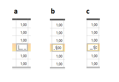When I focus on the cell the caret seems to be placed at the beginning of the content, and (a) happens (see attached file). I wanted to achieve something like (b).