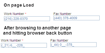 If I then click another page and then use the browser's back button, the phone number is messed up and missing the last 4 digits while the other 6 are in random places within the mask?