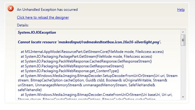 Which version are you using? I believe we resolved a similar issue recently. The exception is caused by the design time dlls not being loaded correctly or missing.
