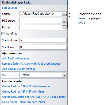 <telerik:RadMediaPlayer ID="RadMediaPlayer1" runat="server" Width="500" Height="400px"> <Sources> <telerik:MediaPlayerSource Path="~/Videos/RadControls.mp4" /> </Sources></telerik:RadMediaPlayer>Please have a look into this complete solution where the above mentioned issue can be replicated. Also I would like to point out that if I select the media file through the controls smart tag, the relative URL generated for the Source will be having the Web application root operator (~) (check the screenshot attached) but the video wont load which seems to confuse the users.
