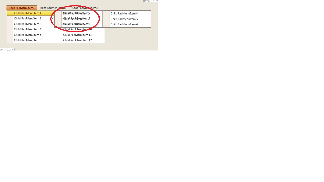 Child RadMenuItem3 under Root RadMenuItem1->Child RadMenuItem1-> becomes transparent and i am unable to select that.I have attached a picture of issue of your code.Please see the attached file.How can i solve that?