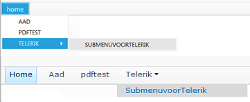 <telerik:RadMenu ID="RadMenu1" runat="server" Skin="Metro"> <Items> <telerik:RadMenuItem Text="Home"> <Items> <telerik:RadMenuItem Text="AAD"></telerik:RadMenuItem> <telerik:RadMenuItem Text="PDFTEST"></telerik:RadMenuItem> <telerik:RadMenuItem Text="Telerik"> <Items> <telerik:RadMenuItem Text="Telerik Child Item"></telerik:RadMenuItem> </Items> </telerik:RadMenuItem> </Items> </telerik:RadMenuItem> </Items> </telerik:RadMenu>Regards,