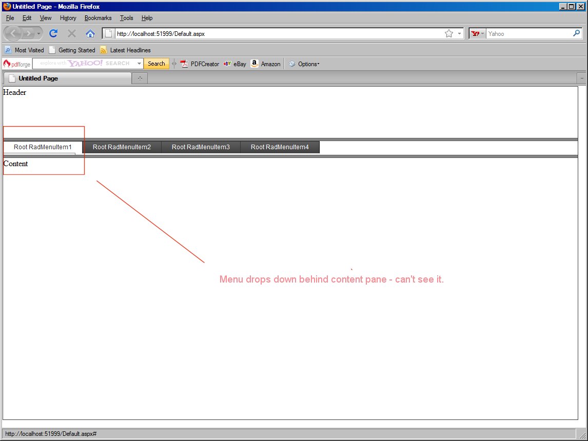The following shows my RadMenu fine except when it drops down the submenu items go behind my content pane rather than over top. How can I fix this?